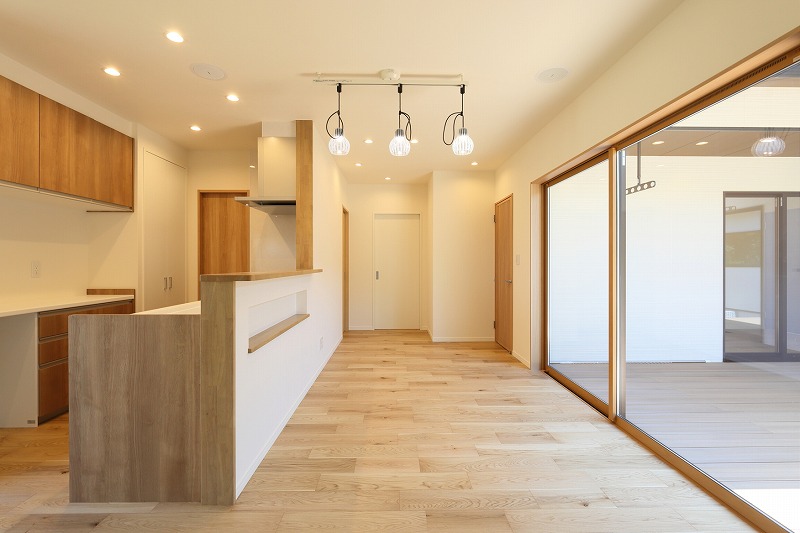 コの字型の中庭に作られたウッドデッキは各部屋に出入りができ、家族が繋がる間取りです。玄関からWICを経由するコンパクトな動線や天上に埋め込まれたスピーカー等も暮らしやすさのポイントです。