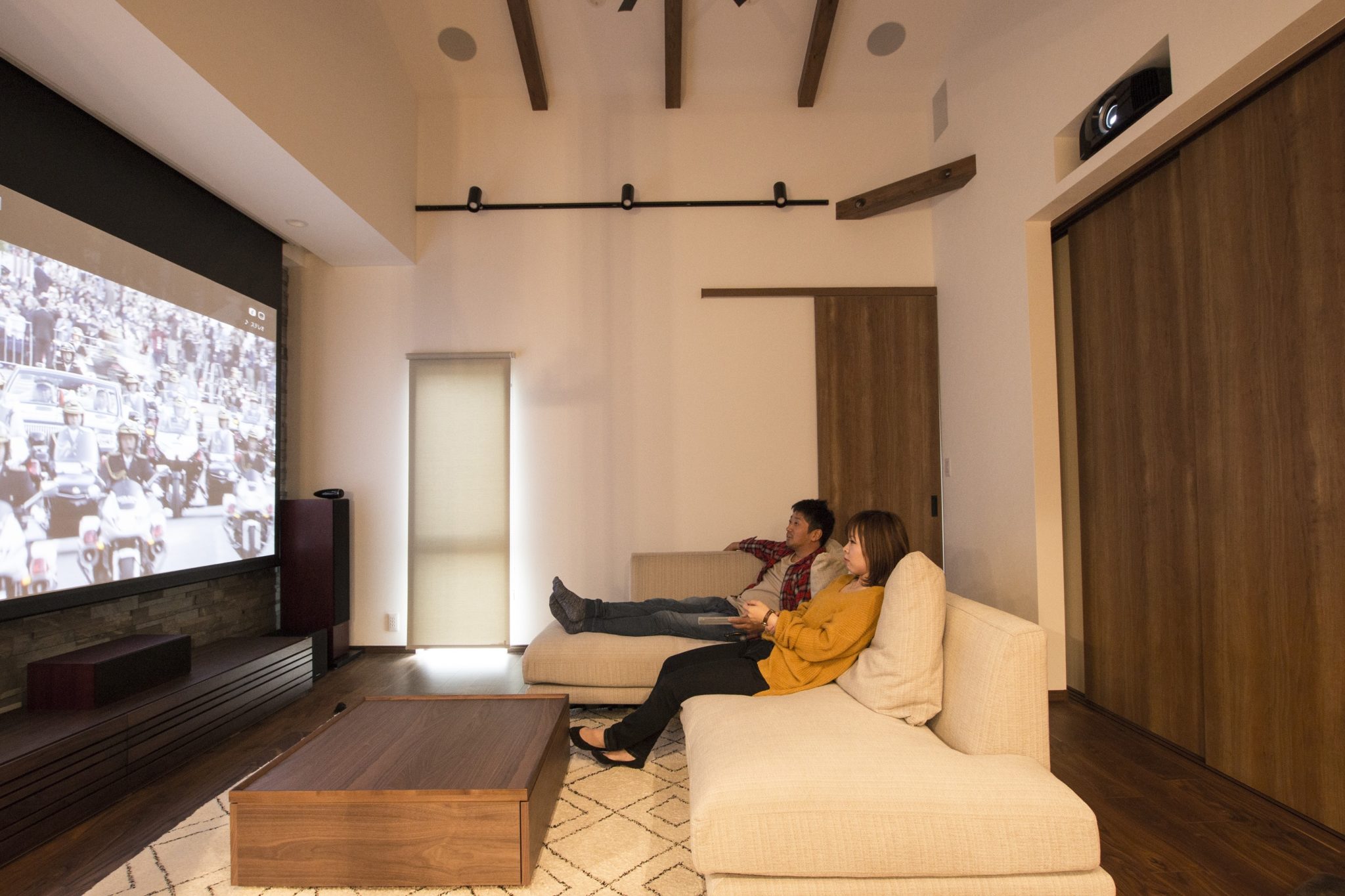 リビングの上部は勾配天井にして、広く感じさせるように工夫。大きなスクリーンがあっても圧迫感のない空間づくりをしています。 また、音響にもこだわり、天井にスピーカーを内蔵しています。