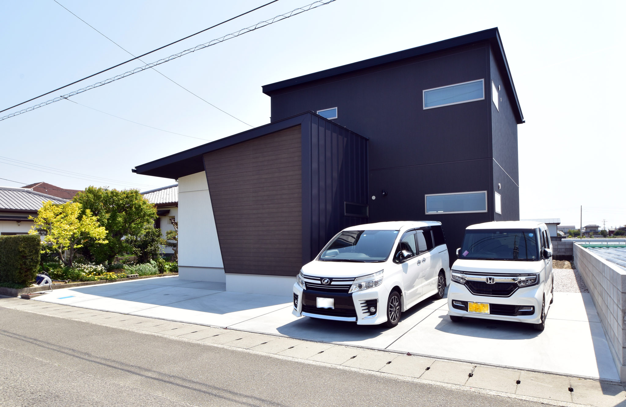 斜めに配した屋根がアクセントになったスタイリッシュな外観のK様邸。