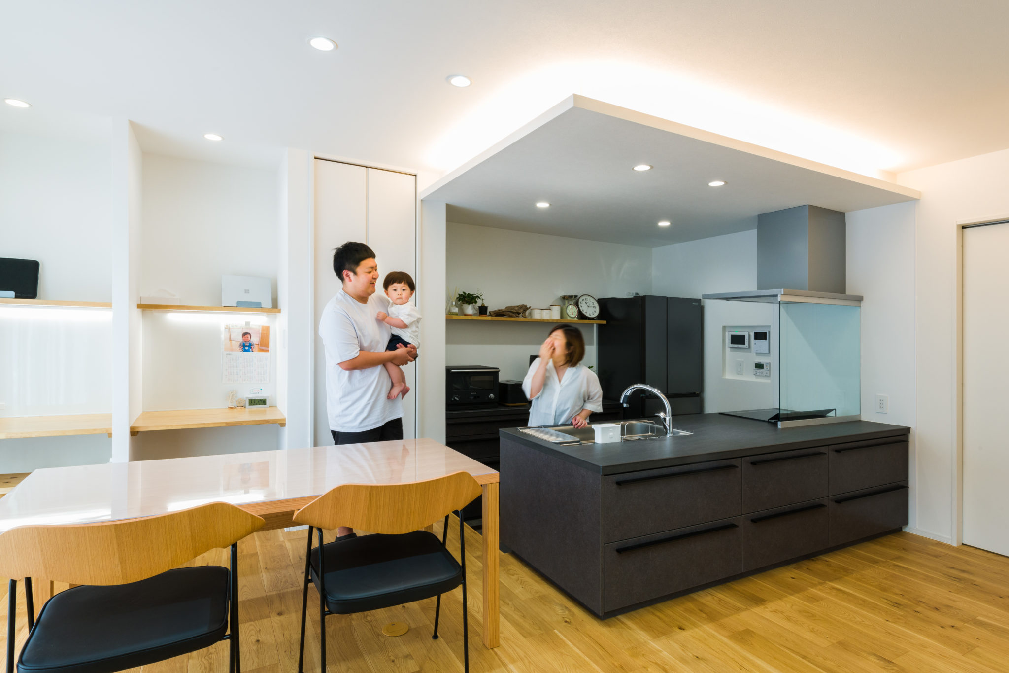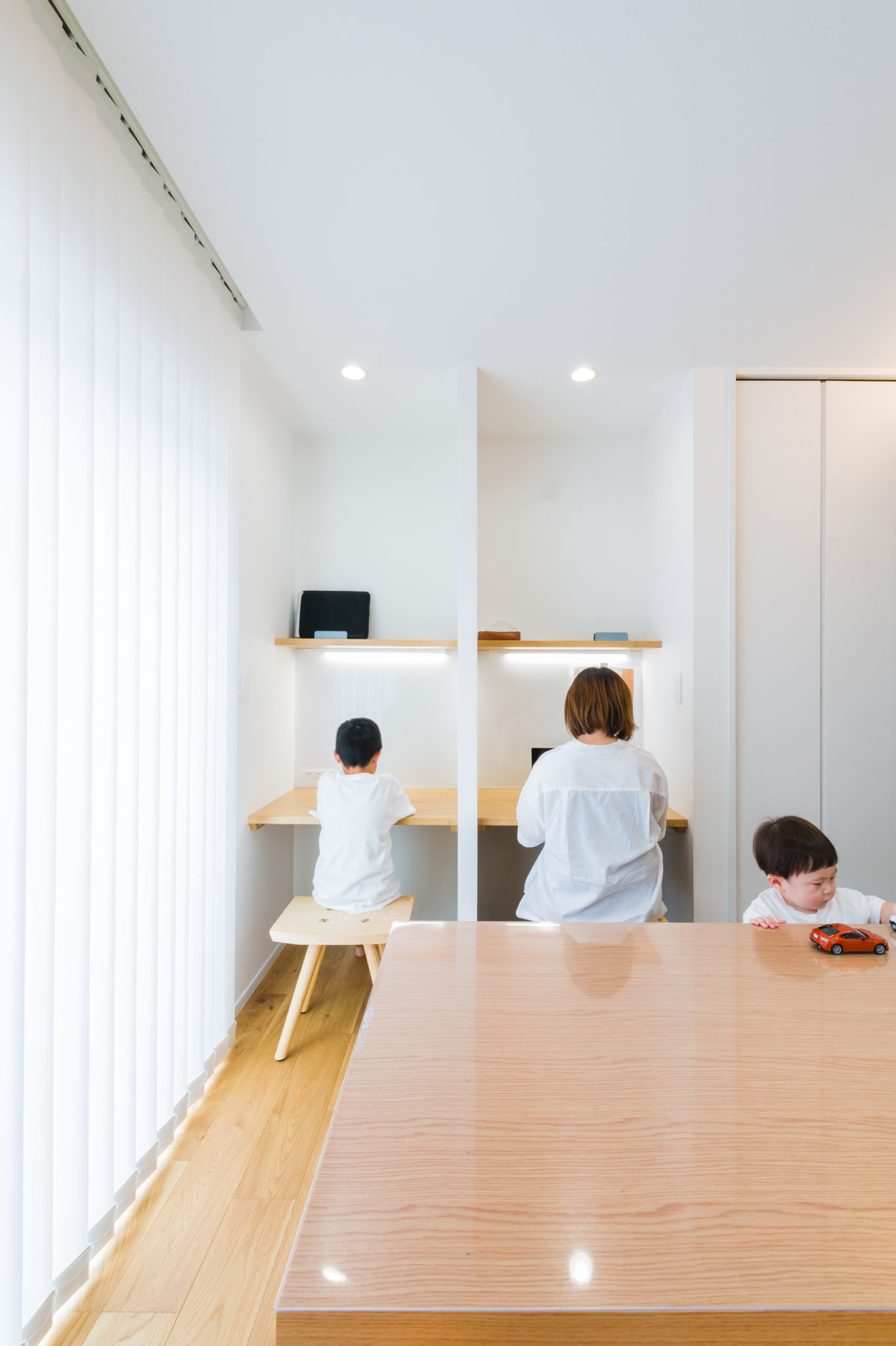 2ヵ所もうけたワークスペースでは、お子様が宿題をしたり、奥様が仕事をしたりと多様な使い方ができます。ワークスペースの棚の高さも、キッチンのカップボード、飾り棚の高さと揃え、凹凸のない空間を徹底しました。