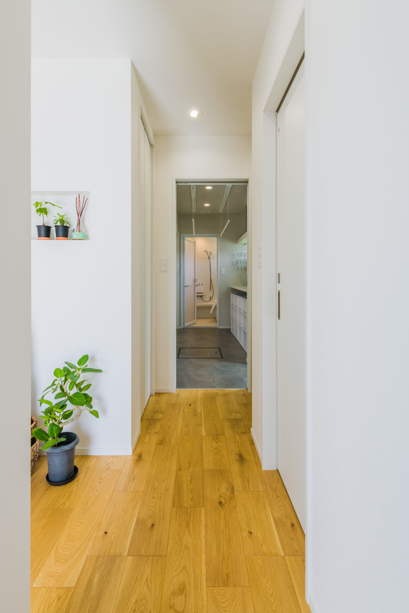 家の中をぐるっと一周できる生活のしやすい間取りに。また、「来客時にはプライベート空間を見せたくない」というI様の希望で、洗面と脱衣室を扉で仕切って分けています。外から汚れて帰ってきても、そのまま脱衣室→バスルームへと直行できるよう、勝手口も脱衣室に繋がっています。