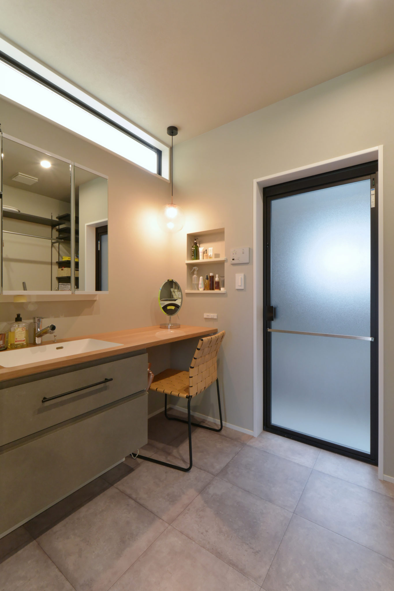 洗面脱衣室は約3帖を確保し、ゆったりと使えるように。洗面台には座って身支度ができるスペースをつくるなど、毎日快適に使える空間を目指しました。