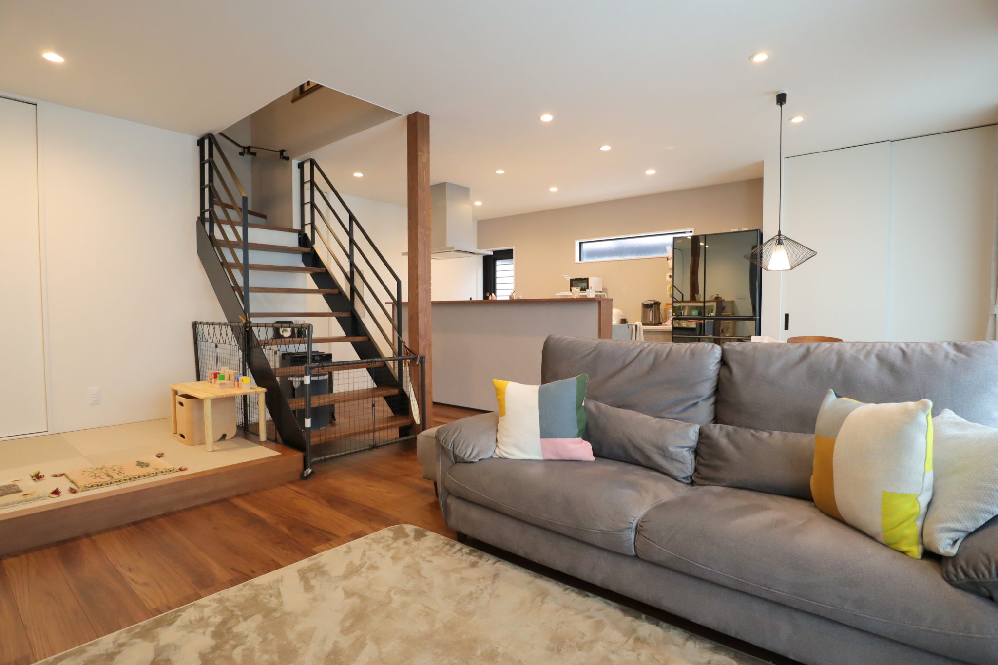 リビングはできるだけ開放的にしたかったという旦那さま。母屋がリビングの前に建っていることや南側に窓をとれない点を考慮し、標準より大きいサイズの掃き出し窓を採用。さらに、LDKの中心に配置したオープン階段は、スチール手摺りにしたことで圧迫感を感じずにゆったりと過ごせる空間に仕上がりました。