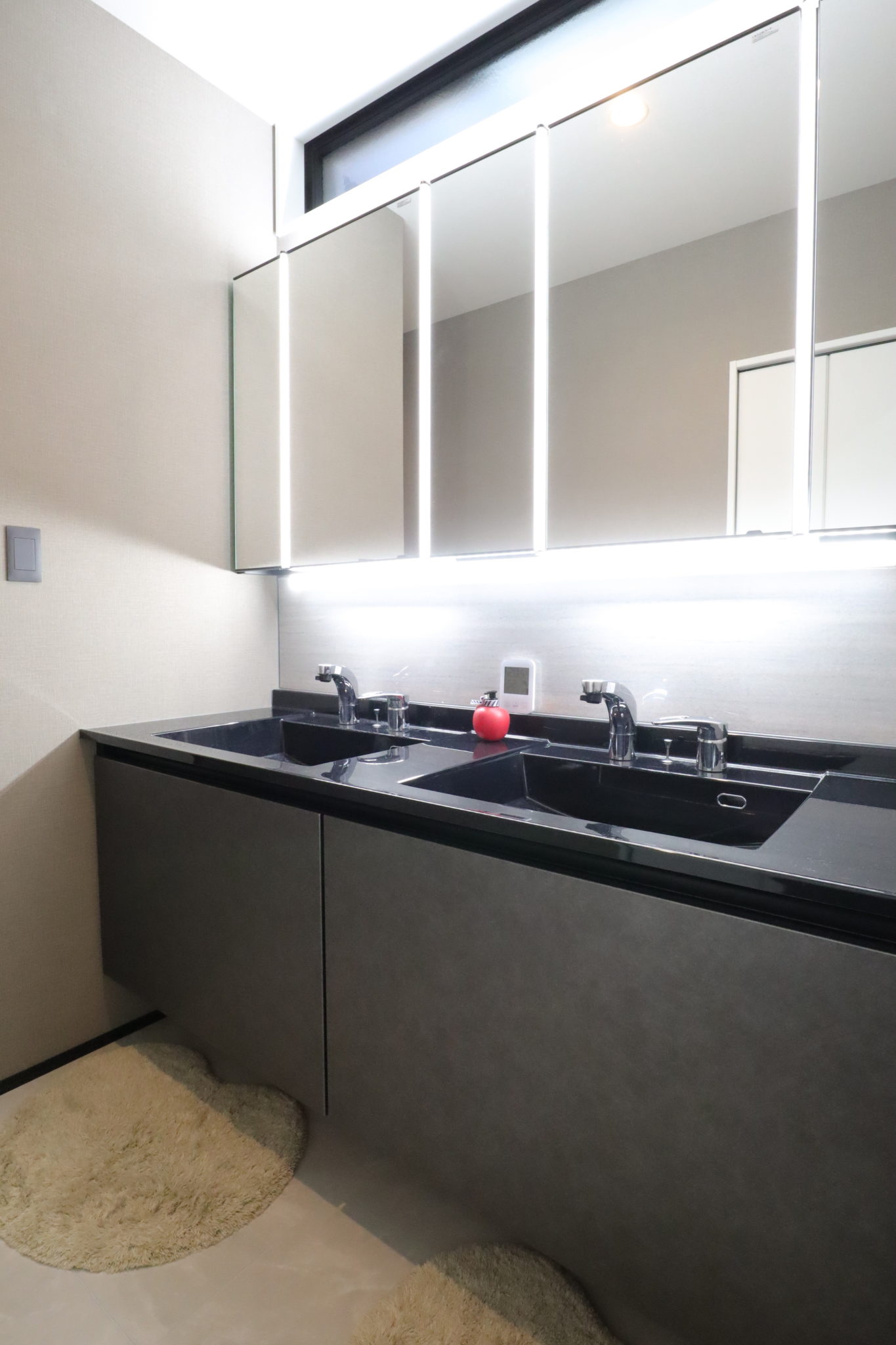 洗面はLIXILの『ルミシス』を採用。奥さまのこだわりで、ご夫婦が同時に支度できるように洗面ボウルを2つもうけています。お子さまが大きくなられてからも、さらに重宝するスペースになりそうです。