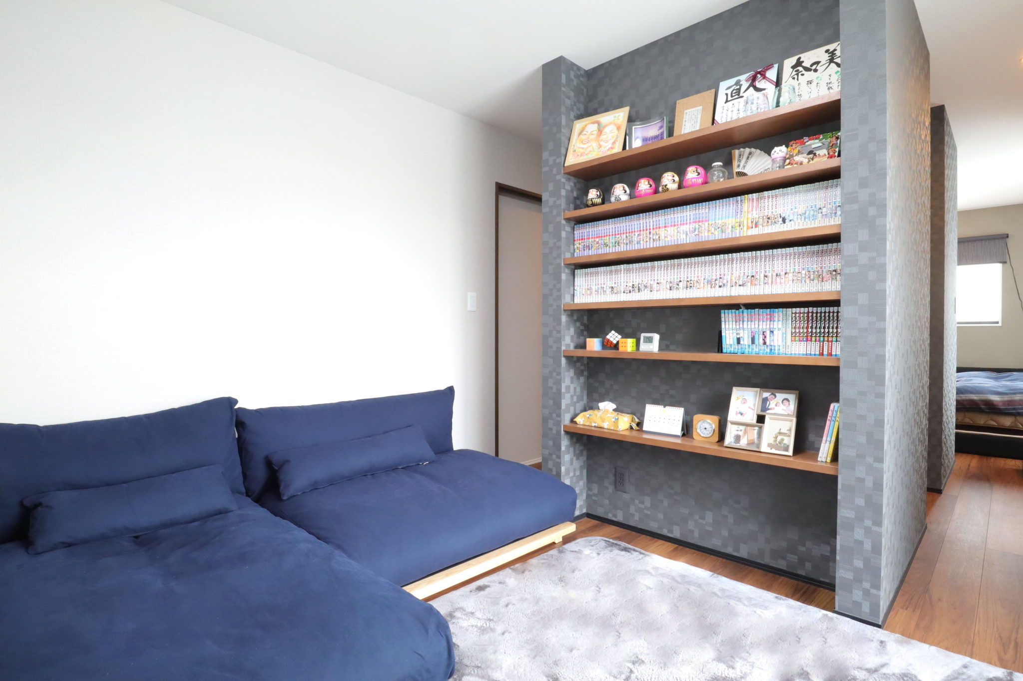 2階の主寝室(8.2帖)と書斎(6帖)の間取りは、弊社モデルハウス『CRAS』を参考にされたそう。中心にあるWICが緩やかに空間を区切り、家族の気配を感じながらそれぞれの時間を過ごすことができます。お子さまが寝た後の奥さまの読書タイムも、安心して楽しめているそうです。