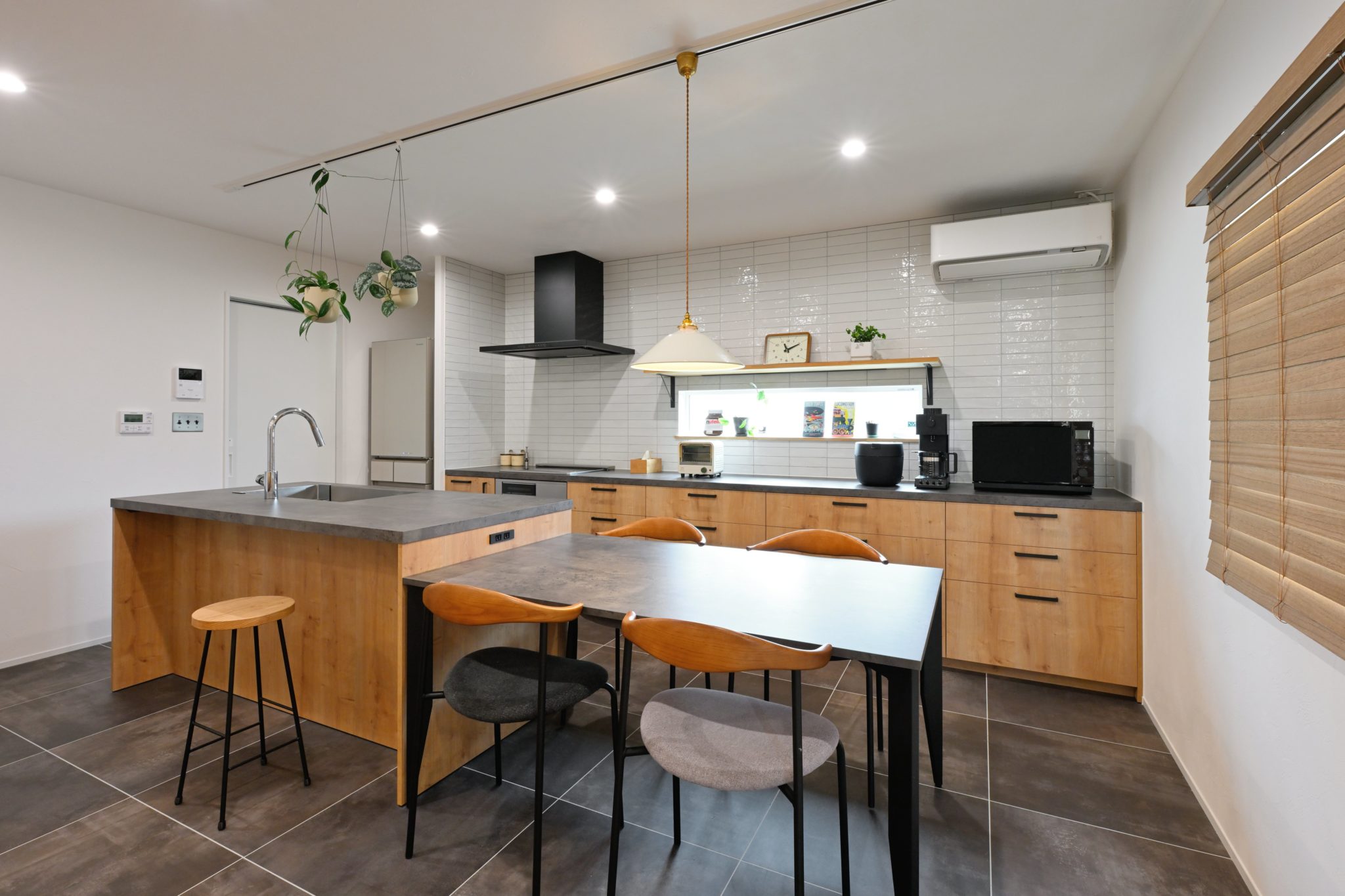 石目の天板とオーク柄を組み合わせた、キッチンハウスのセミオーダーキッチン。シンクとコンロが分かれたⅡ型キッチンにすることで作業スペースを広く確保しています。また、ダイニング・キッチンのスペースに貼ったフロアタイルは、白目地を入れることで本物のタイルのような仕上がりに。