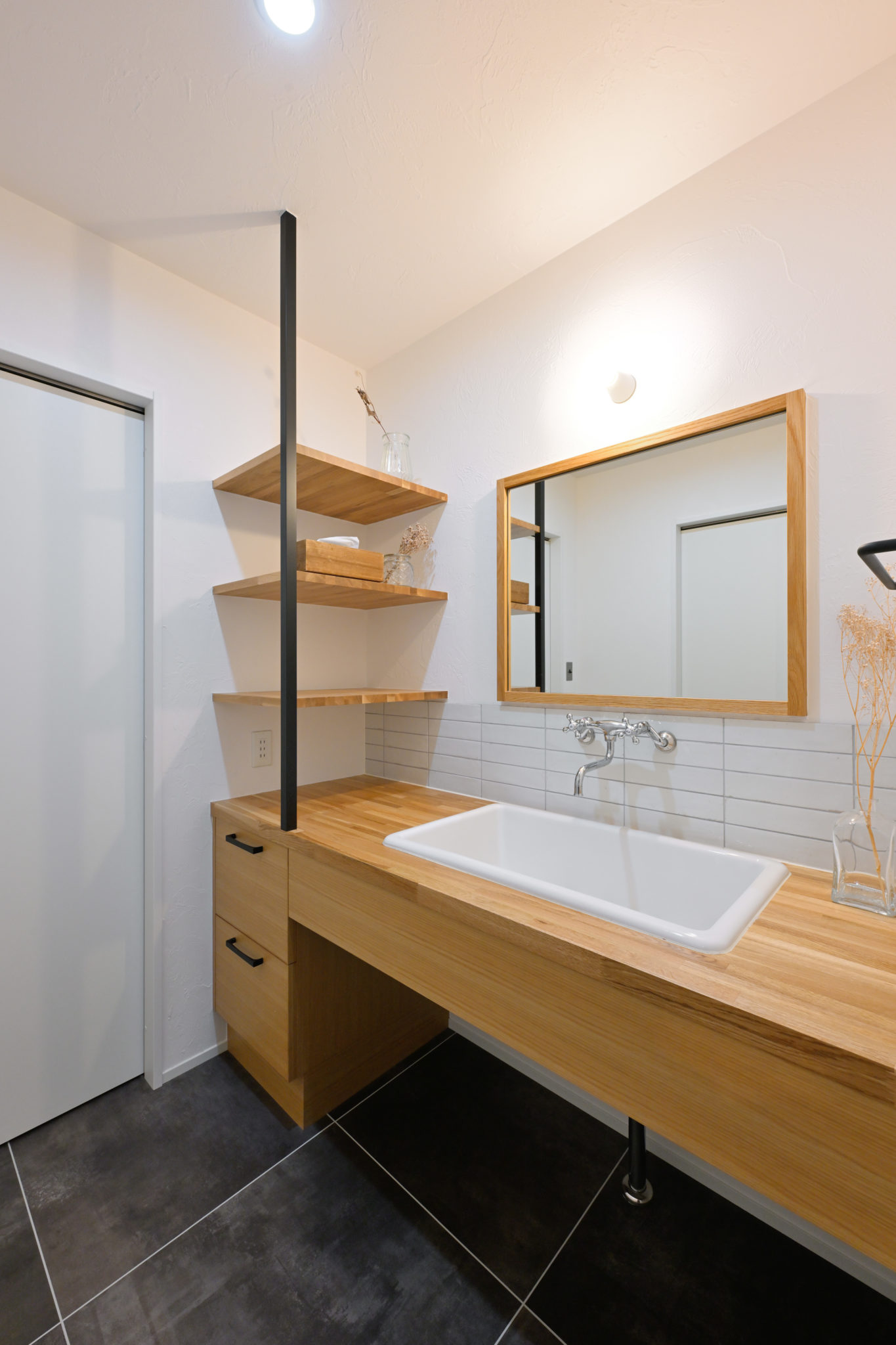 オリジナリティのある洗面台は、TOTOの医療用シンクやハンドル混合栓、造作の収納棚などこだわりがたっぷり。洗面台の幅は約1m80cm確保しているため、ゆとりをもって使うことができます。