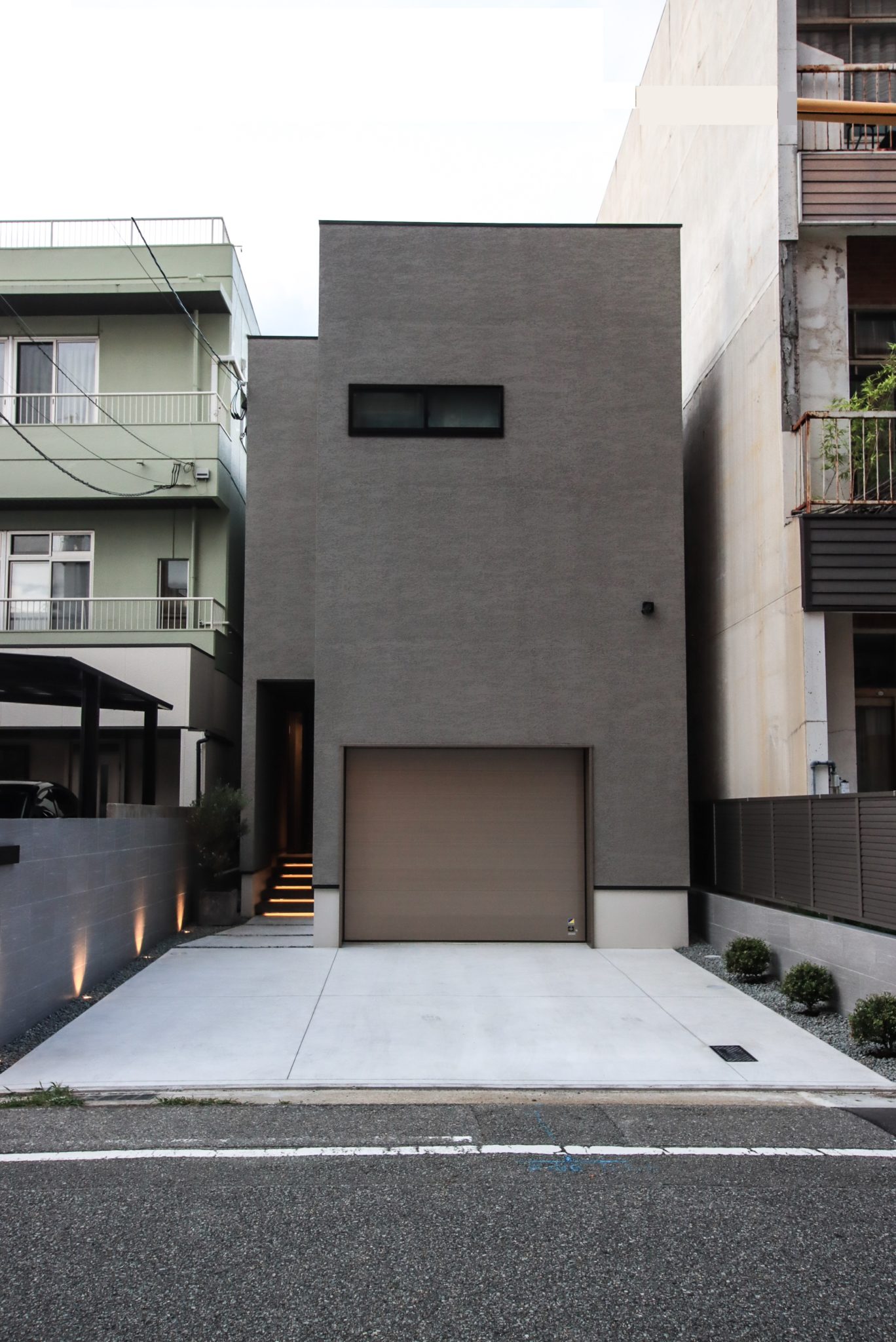 インナーガレージのある外観は、仕上げ塗材『ベルアート』(SK化研)を採用。お店の中に入る際にワクワク感を感じてほしいとの想いから、入口から店舗内が見えない設計に。また、店舗前には二台ほど駐車できるスペースを確保しています。