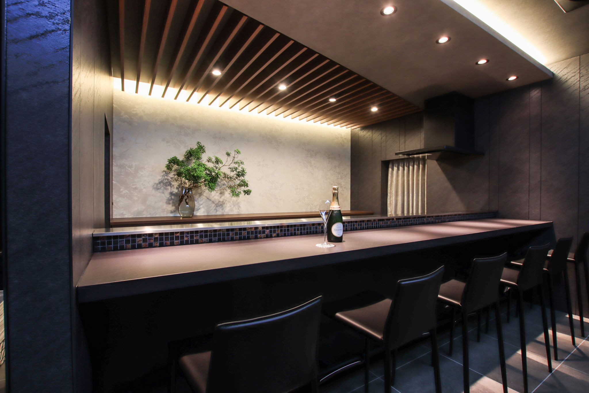 ダウンライトの光が美しく照らすカウンターは、キズや汚れに強いセラミック素材を採用。天井に施したルーバーやアクセントのクロスなどデザイン面にもこだわりがたっぷり。ハイセンスな空間で贅沢なひと時を楽しめそうです。