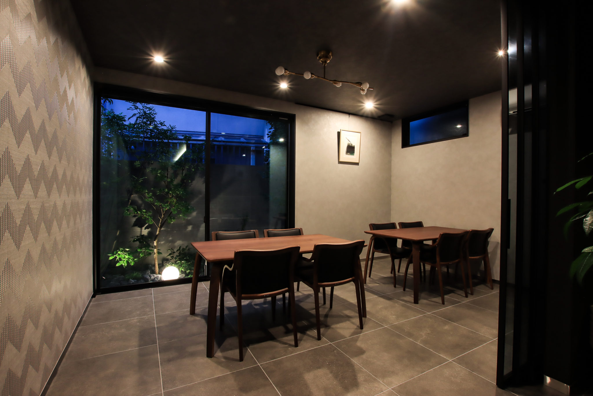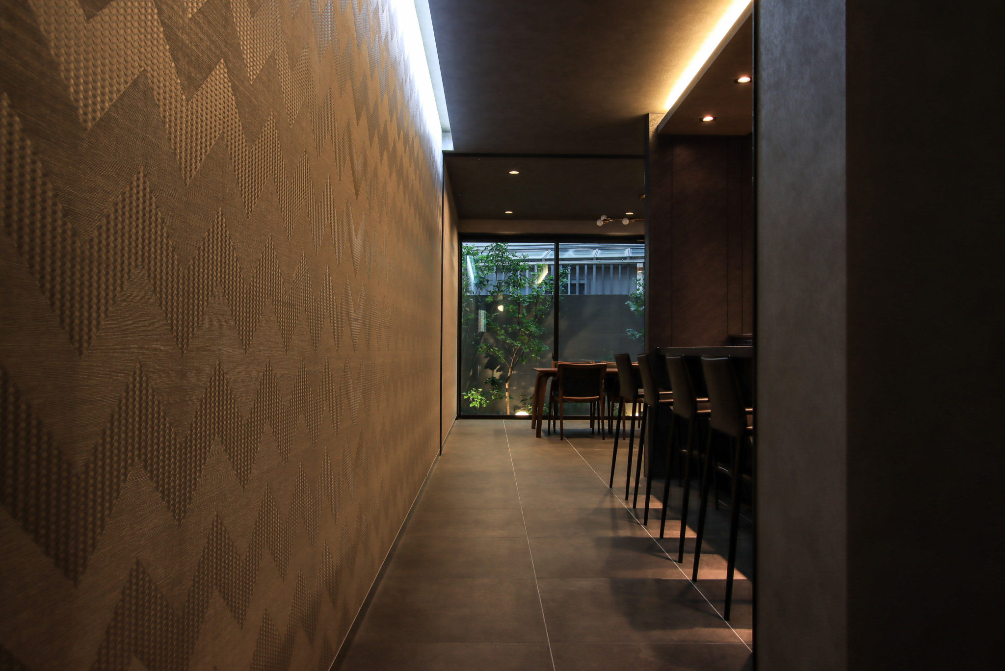 重厚感のある造作扉を開けると、奥の大きな窓へと視線が抜ける設計になっており、店主であるH様お気に入りの眺め。奥行きが深い造りは、京都の町屋を思わせます。 また、アクセントクロスとして採用したのは高級スポーツカー『ランボルギーニ』とコラボした商品。間接照明の光とマッチし、大人な空間に仕上がりました。
