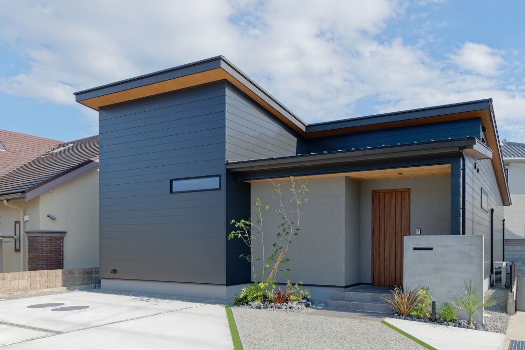 ベースは黒いガルバリウムで、玄関周りのアクセントはグレーの塗り壁、軒天に木目を採用。異なる素材の組み合わせがマッチして印象的な外観に仕上がっています。片流れの屋根も意匠性をアップさせています。