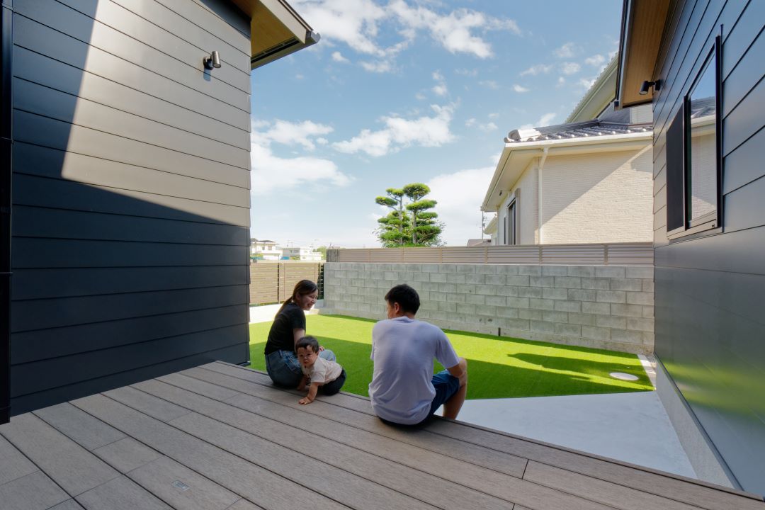 芝を引いた中庭を囲むように建つ平屋。リビングからダイレクトにウッドデッキに出られ、友人を招いてのBBQや家族との憩いの時間を過ごせます。ウッドデッキは広く設けられているため、お子さまが遊ぶのにもぴったりのスペースです。