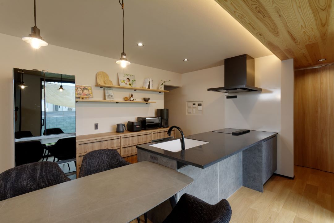淡い木目を基調とした中に、グレーのキッチンが空間全体のアクセントに。レンジフードやワークトップ、冷蔵庫をブラックで統一。LDK(20帖)を引き締めるカラーリングは奥様のお気に入りです。また、カップボードの奥にはパントリーを設けており、そこから水廻りにつながる、スムーズな動線を描いています。