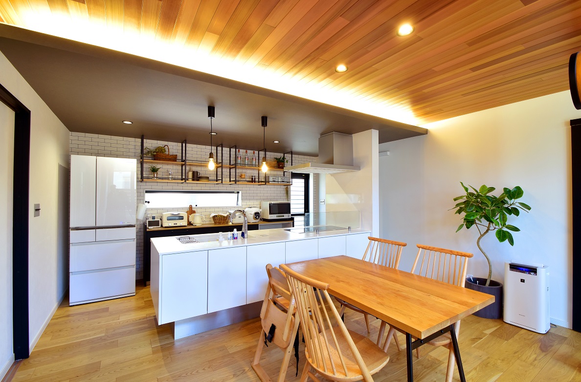 自由に物を飾ることができる飾り棚や、タイル調の壁紙がポイントです。また、キッチン上部の間接照明がダイニングをやさしく照らしてくれます。