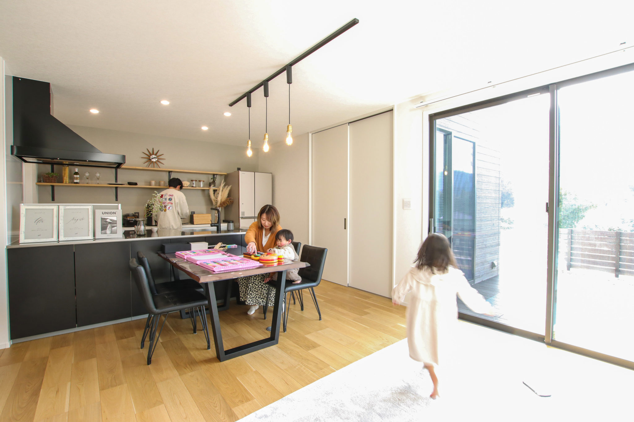 ご夫婦ともに希望していた吹き抜け。大開口の窓から差し込む光が、部屋全体を明るく包み込みます。リビングから池田町のきれいな景色が見えるのもポイント。モダンな雰囲気で統一されており、ご夫婦の理想としていた空間が実現しました。