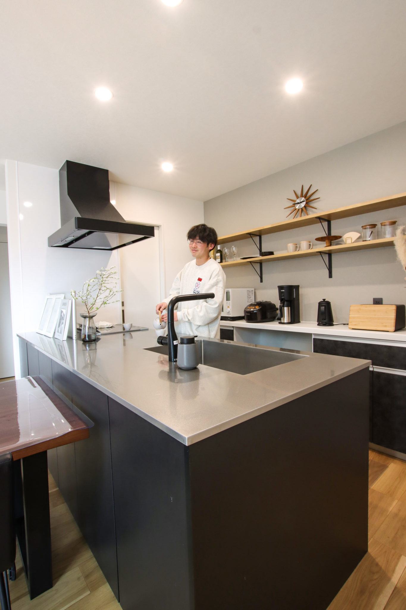 スクエアシンクが特徴のスタイリッシュなデザインのキッチン。元料理人の旦那さまは、ステンレスの天板が気に入ったそう。カップボード上の飾り棚には、お家の雰囲気に合わせたお気に入りの雑貨を飾っています。