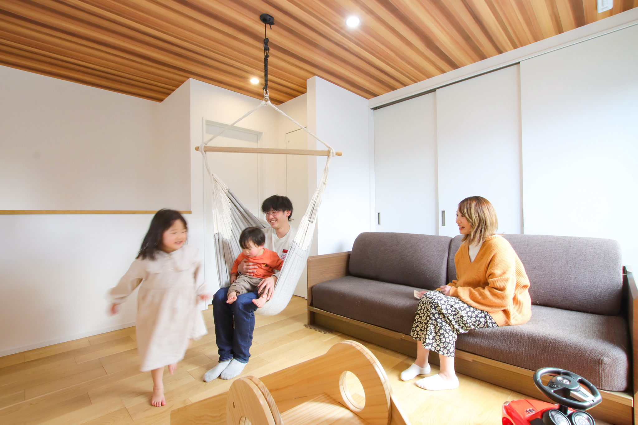 天井にはサンゲツの木目調のクロスを採用し、温かみのある雰囲気になっています。また、約6帖あるバルコニーとの繋がりにより、開放感あふれる空間に。ハンモックやソファーを置いて、家族みんなでゆったり過ごせる空間になっています。