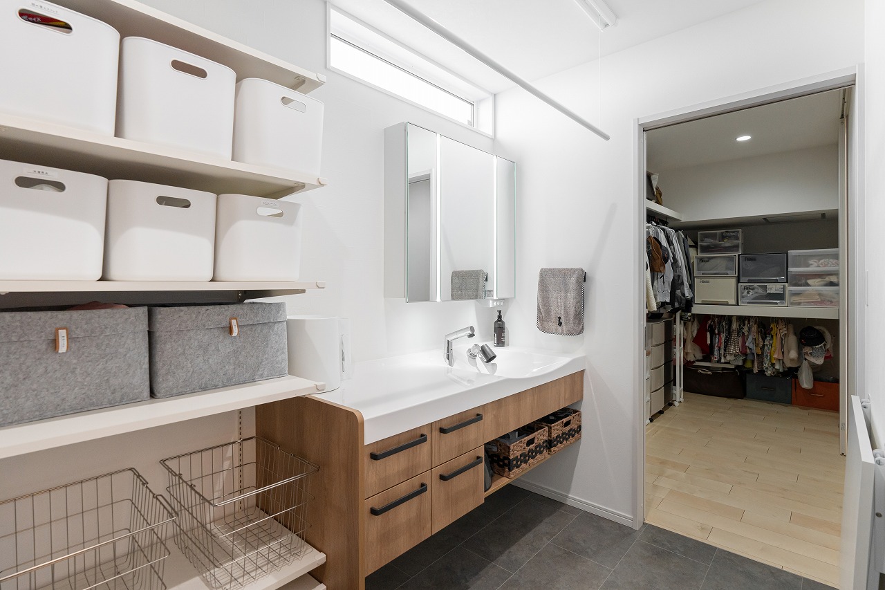 ランドリースペースとファミリークローゼット(4帖)を隣接させることで洗濯家事の負担を軽減。可動棚は収納BOXのサイズに合わせて調整し、シンデレラフィットを実現!さらに、洗面の反対側にアイロンがけで重宝できる折り畳み式テーブルを設置するなど細かな工夫が散りばめられています。