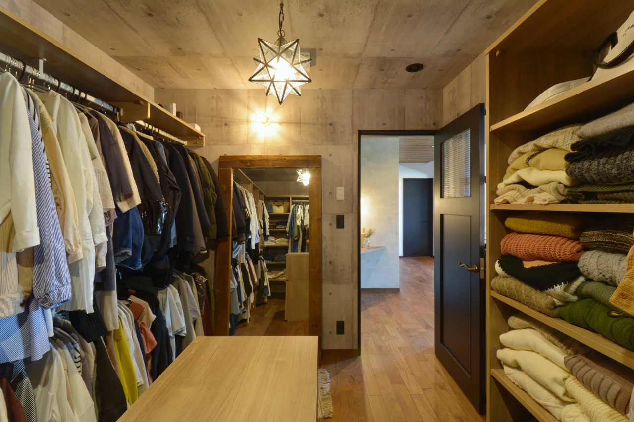 2階のWICは、ファミリークローゼットとして活躍。クロスや建具、照明などもオシャレにして、さらにセンターテーブルを置くことでアパレルショップの一角のような雰囲気を演出。おしゃれ好きだからこそ、できたこだわりの部屋です。