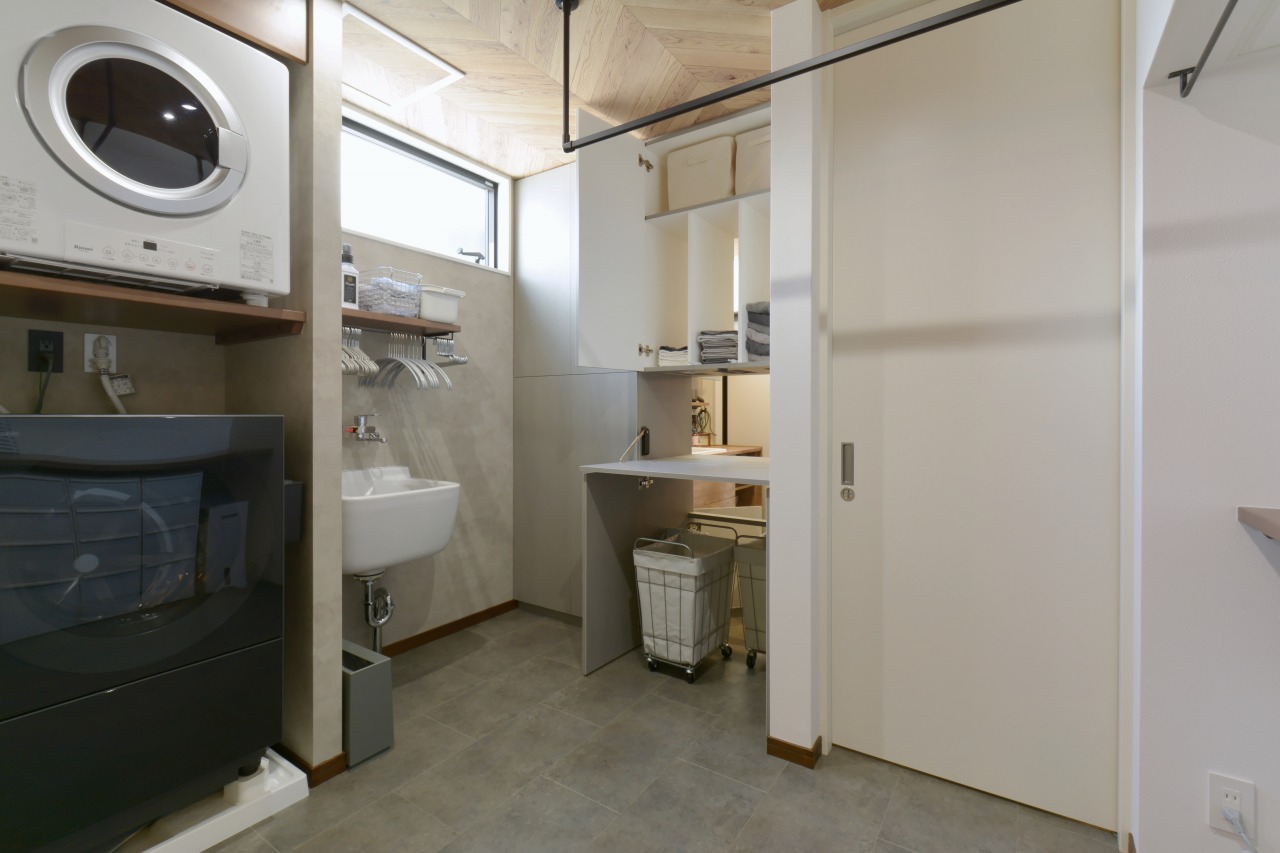 ランドリールームは約3.5帖ほど確保し、スロップシンクやガス衣類乾燥機『乾太くん』など、家事ラクアイテムを採用しています。さらに、注目すべきはスペース奥に設置された棚。扉を開けると隣合った洗面脱衣室と繋がっていて、洗濯したタオルを収納すると洗面脱衣側からも取れるというアイデア満載の間仕切り収納。