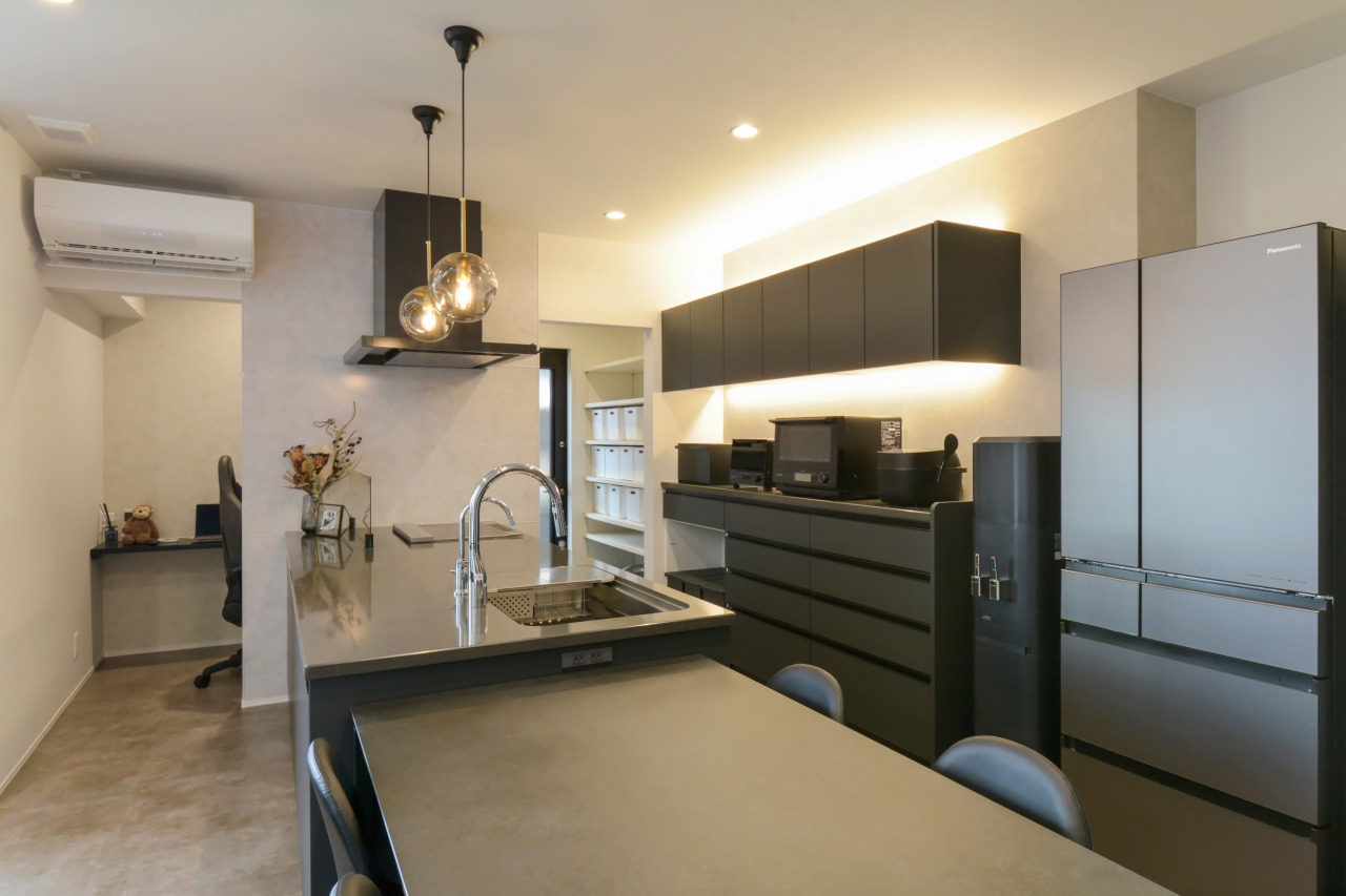 濃いグレー色のオープンキッチンとカップボード。カップボード側の吊収納に間接照明を設置し、やさしくスペースを照らします。 家電やダイニングテーブルも同色でまとめられ、統一感のある美しいスペースに。