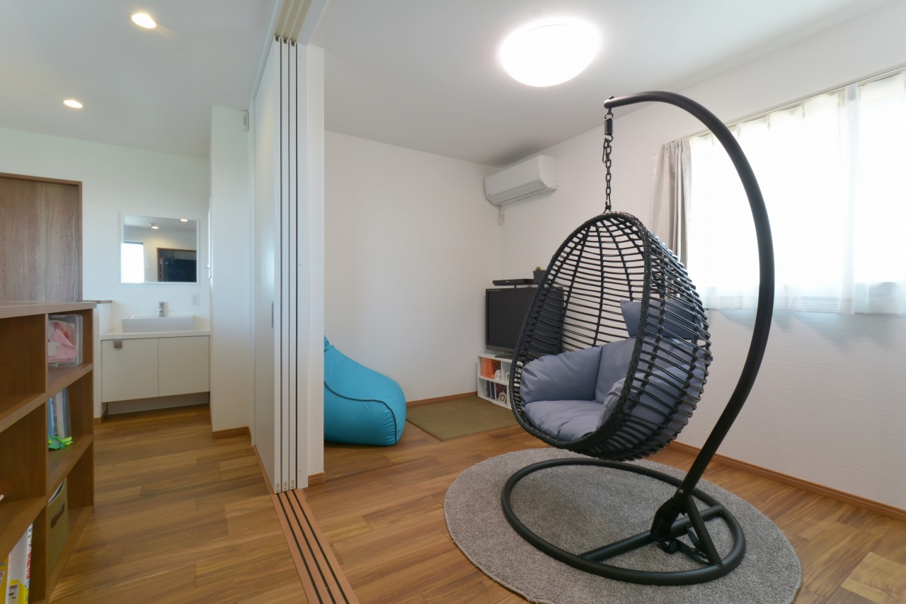 2階ホールに面したマルチスペース(5帖)は、子どもたちのプレイルームとして活躍。廊下を挟んで向かい側は収納量たっぷりな本棚が配置されています。お子さまが遊ばなくなったら、ゆくゆくは奥さまが自分の時間を過ごせるチルスペースになる予定。