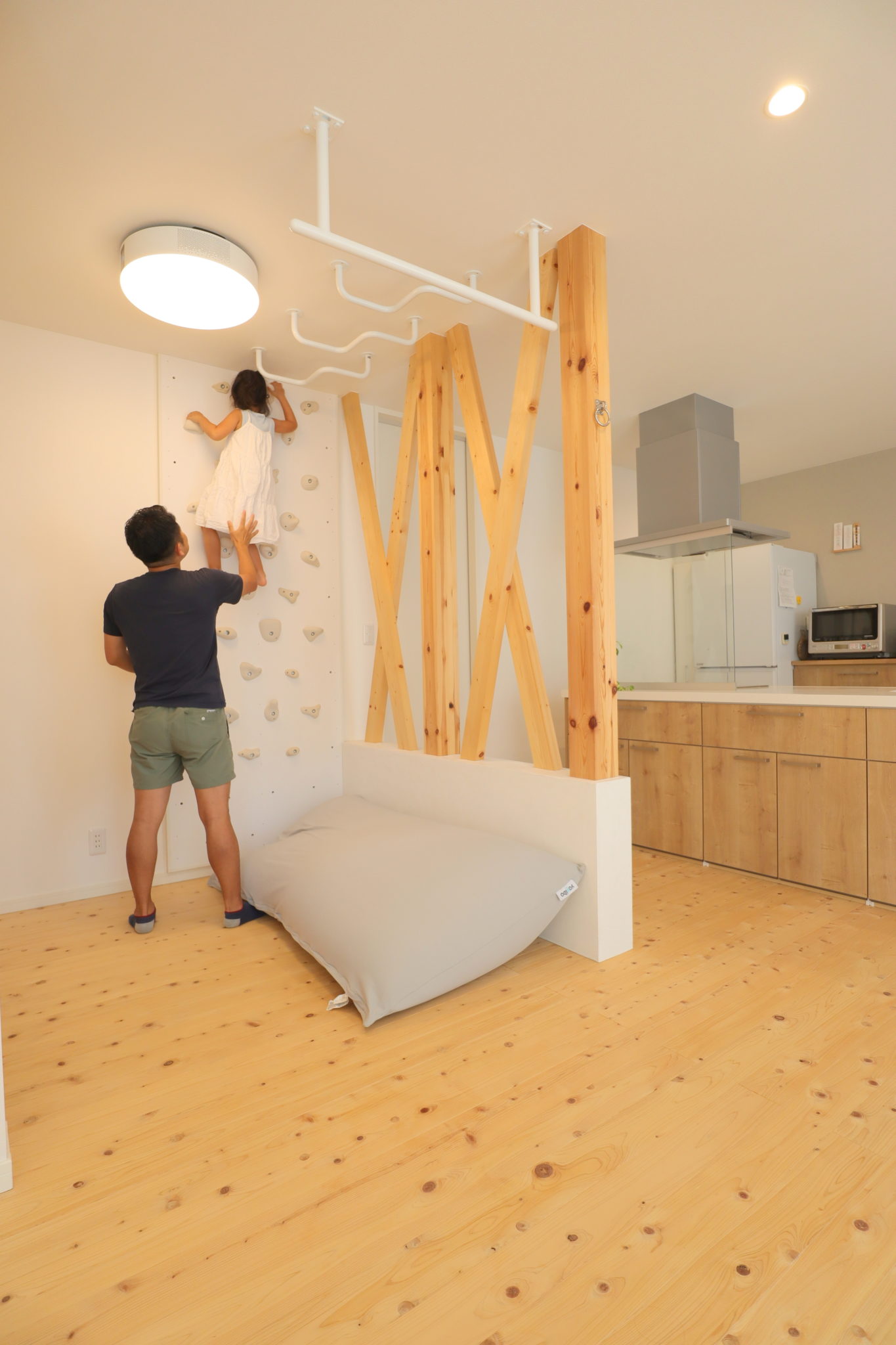LDKにもうけた遊び場には、ロッククライミングやうんていをもうけており、いつでも楽しめる空間になっています。さらに、『ポップインアラジン』を設置したことで、遊び場がシアタールームとしても早替わりします。