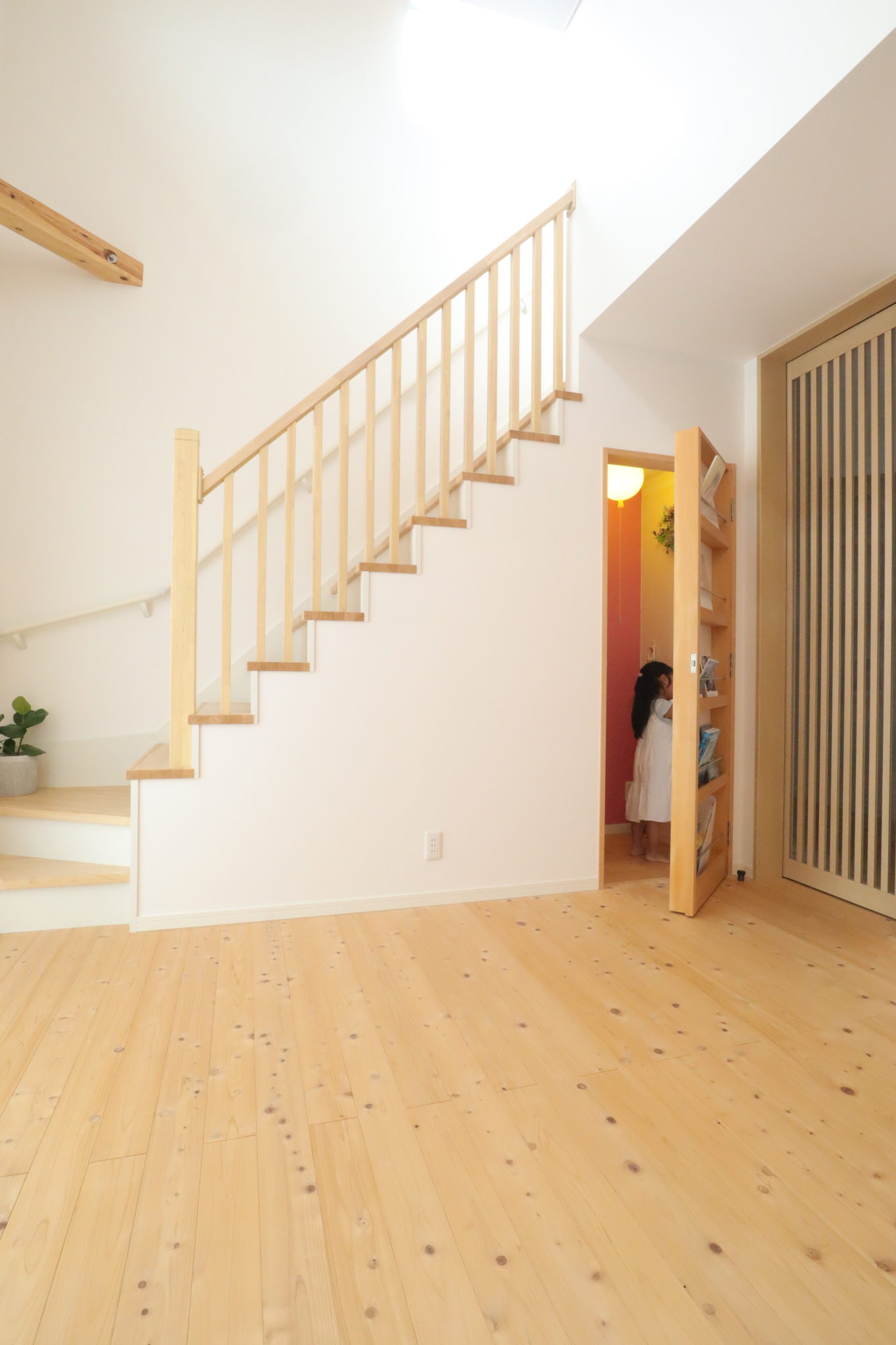 お子さまのお気に入りだという"隠し扉”。大好きなお絵かきができるよう壁にホワイトボードを貼ったり、工作グッズを収納しています。デッドスペースになりやすい階段下を上手く有効活用した空間です。