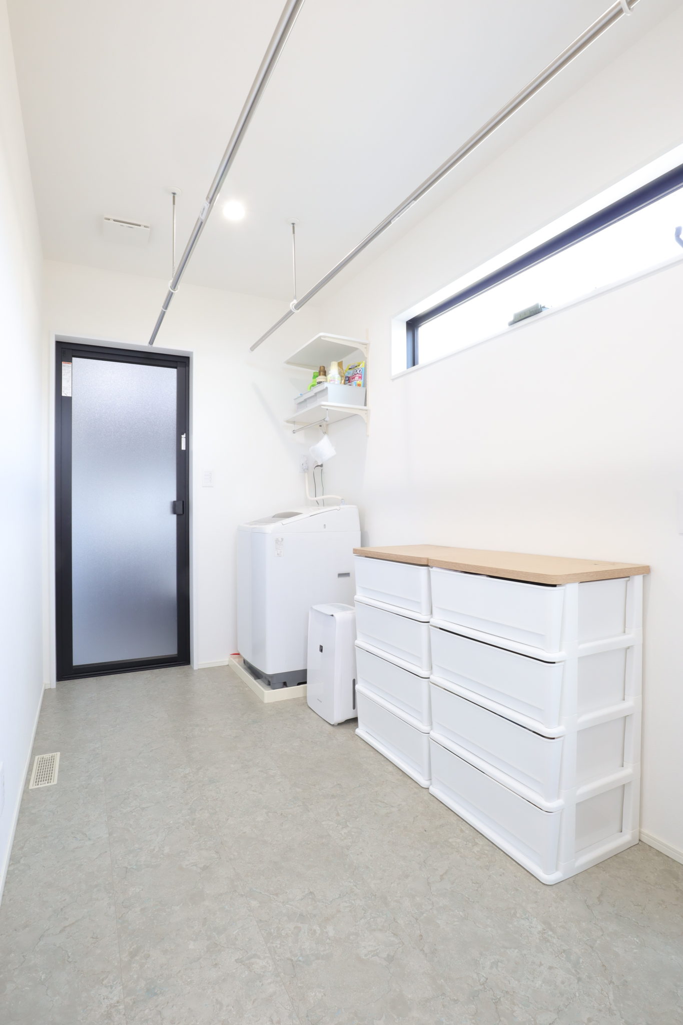 雨の日も関係なく洗濯物を干すことができる便利な脱衣室兼ランドリールーム(4帖)。フリーソーラーを採用しているため、昼間にサーキュレーターを付けたままにしていても光熱費を抑えることができます。これから家づくりをする方に「おすすめしたい!」と言うほど重宝されているそう。