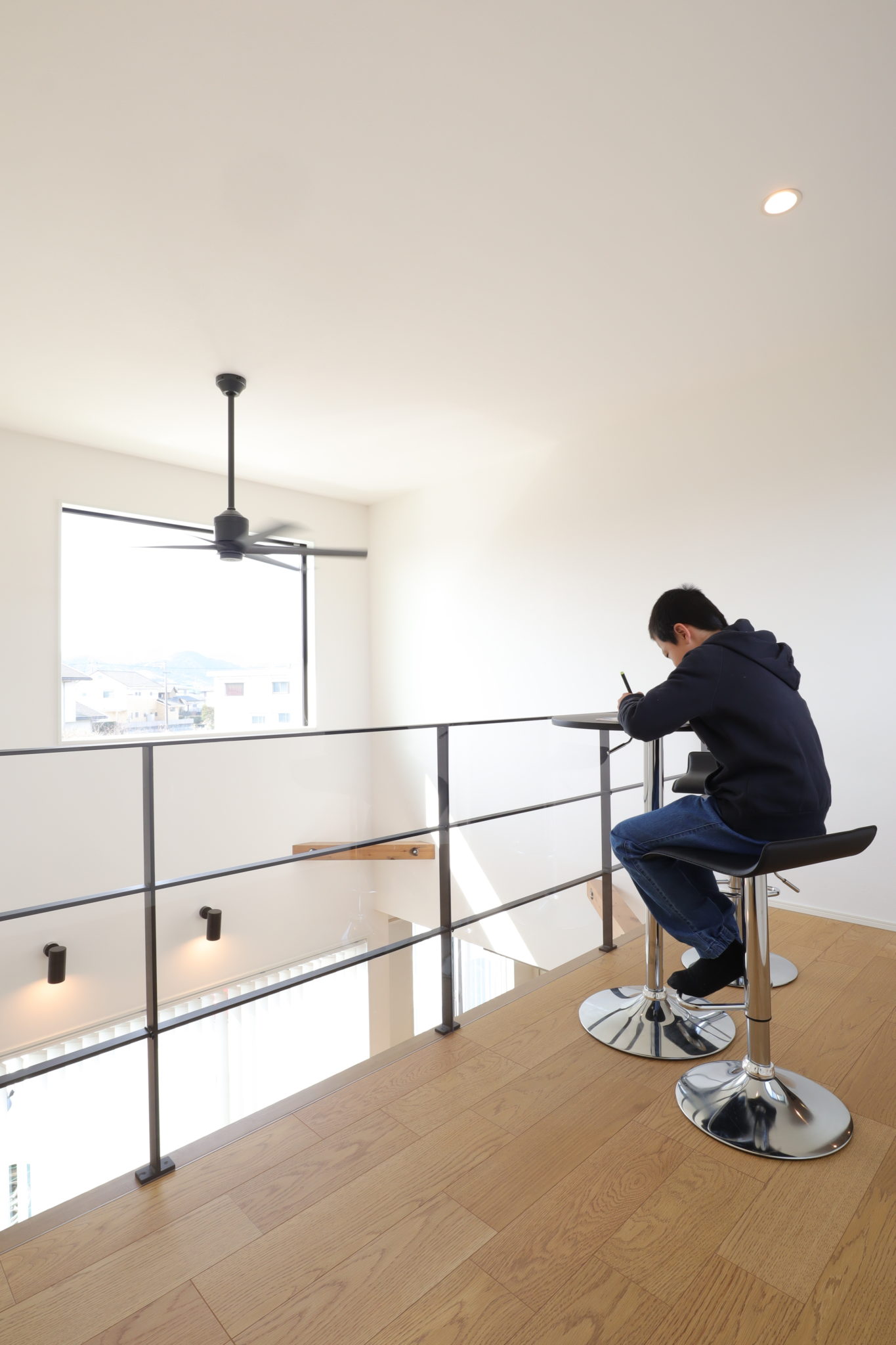 息子さんのスタディコーナーとして活躍しているセカンドリビング(4帖)。吹抜けを介してリビングとつながるため、家族の気配を感じながら過ごせる空間です。