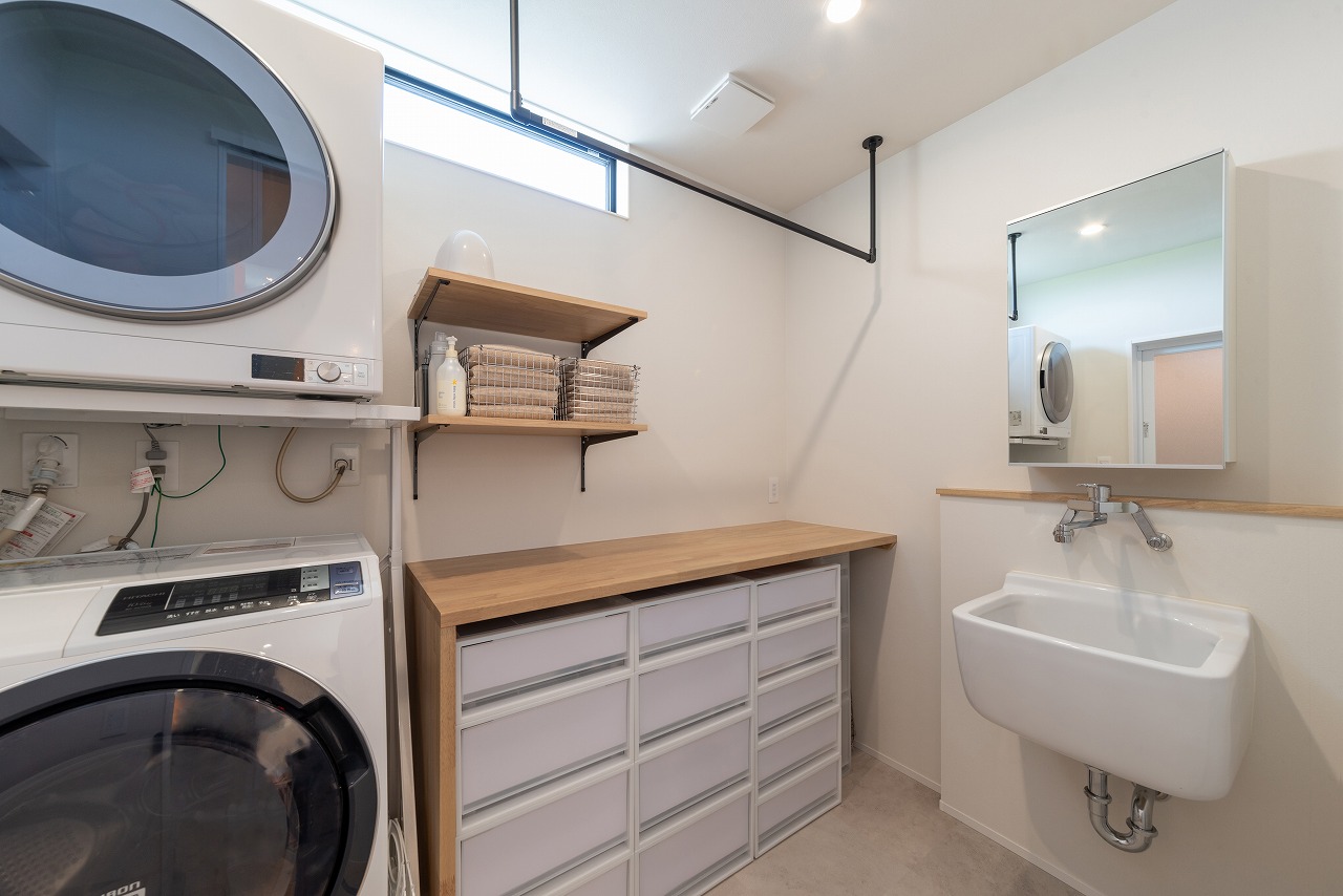 キッチン奥には脱衣室兼ランドリールームが。スロップシンクや作業ができるカウンターを設けられており、充実したスペースになっています。また、スロップシンクは手洗いや洗面にも活用でき、セカンド洗面台としても活躍しています。