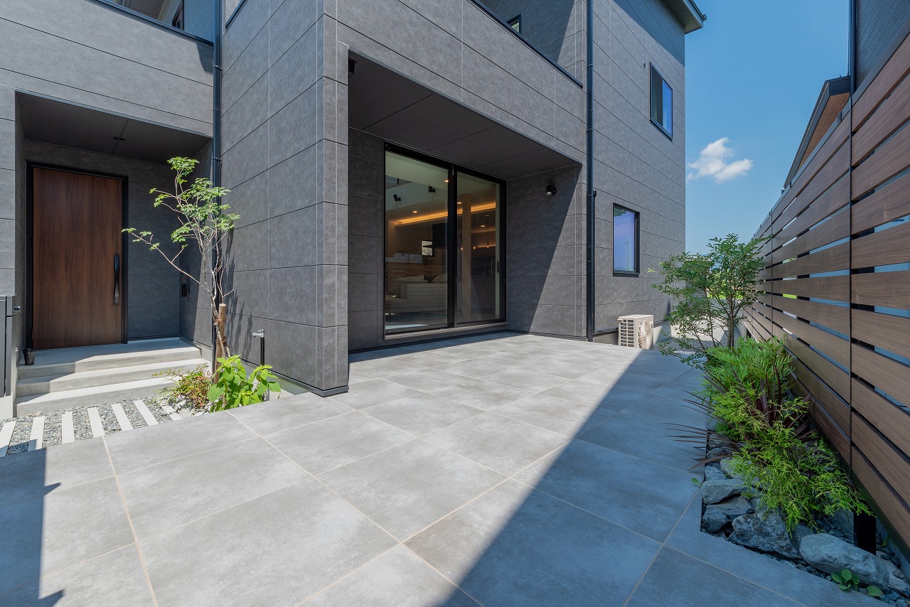 大判のタイルを敷き詰めたデッキは都会的な雰囲気。見た目だけでなく、BBQや子供の水遊びなど様々な場面で活躍しています。さらに、このデッキをつくることで隣家との距離が生まれ、大きな窓を設けても周りを気にすることなく家中で過ごすことができます。