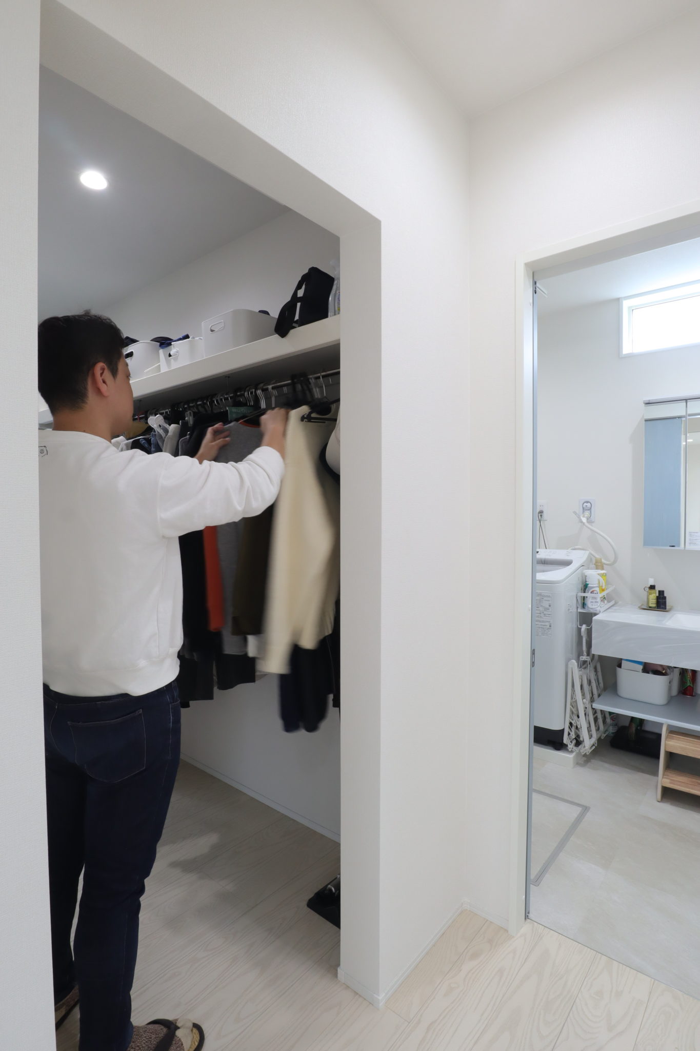 乾いた洗濯物をすぐに収納できるよう、ファミリークローゼット奥に勝手口を配置。脱衣所とも隣接しているため洗濯家事がこのスペースで完結できます。また、キッチン↔WIC↔リビングを回遊できるスムーズな動線も時短ポイントの一つ。