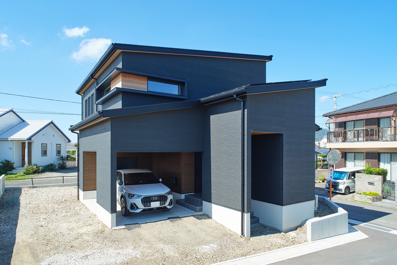 ブラックと木目のサイディングでコーディネートした外観は、弊社モデルハウス『Can!』を参考にされたそう。装飾庇を採用し意匠性もアップ!さらに、雨の日も濡れる心配のないビルトインガレージを取り入れたこともポイントです。