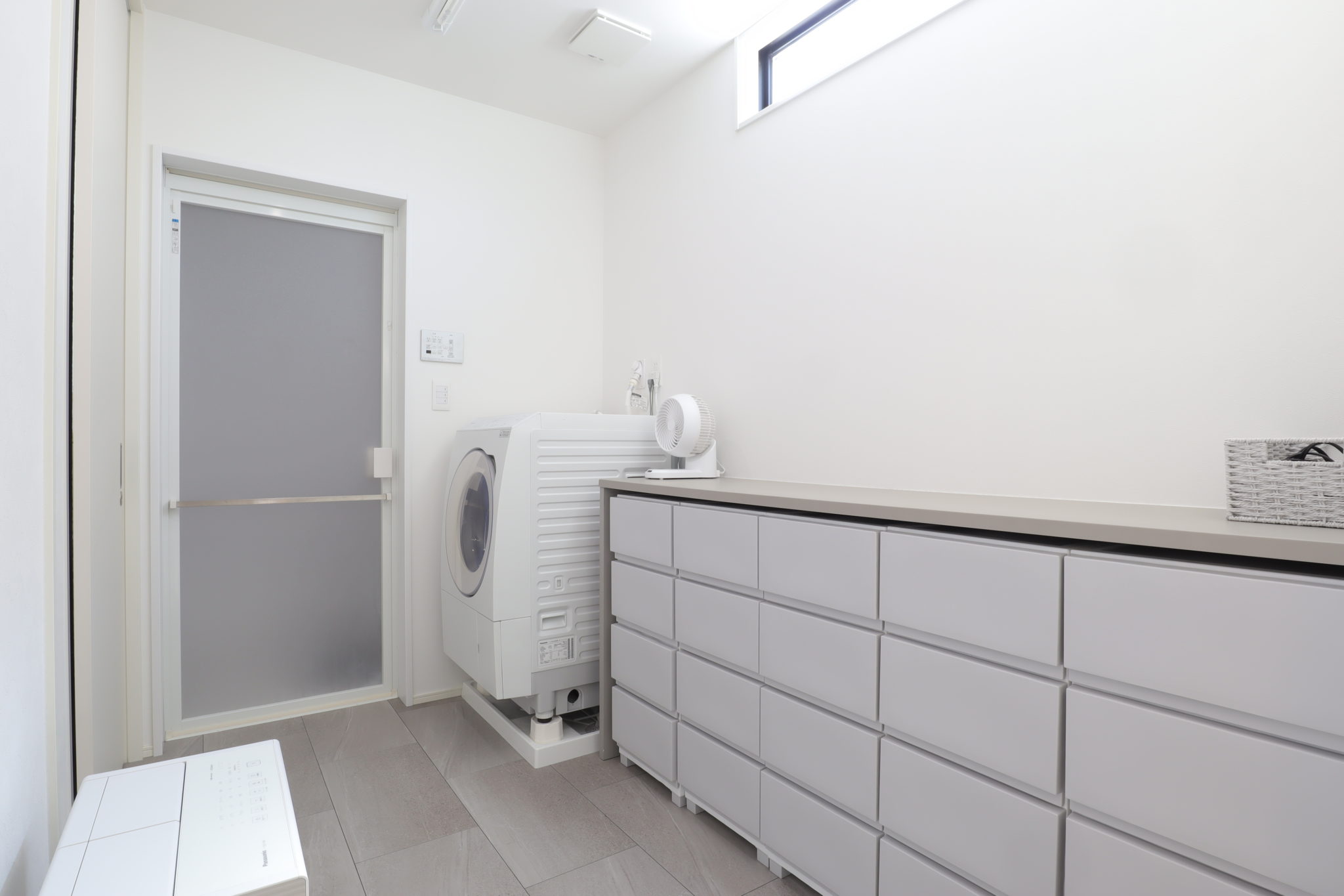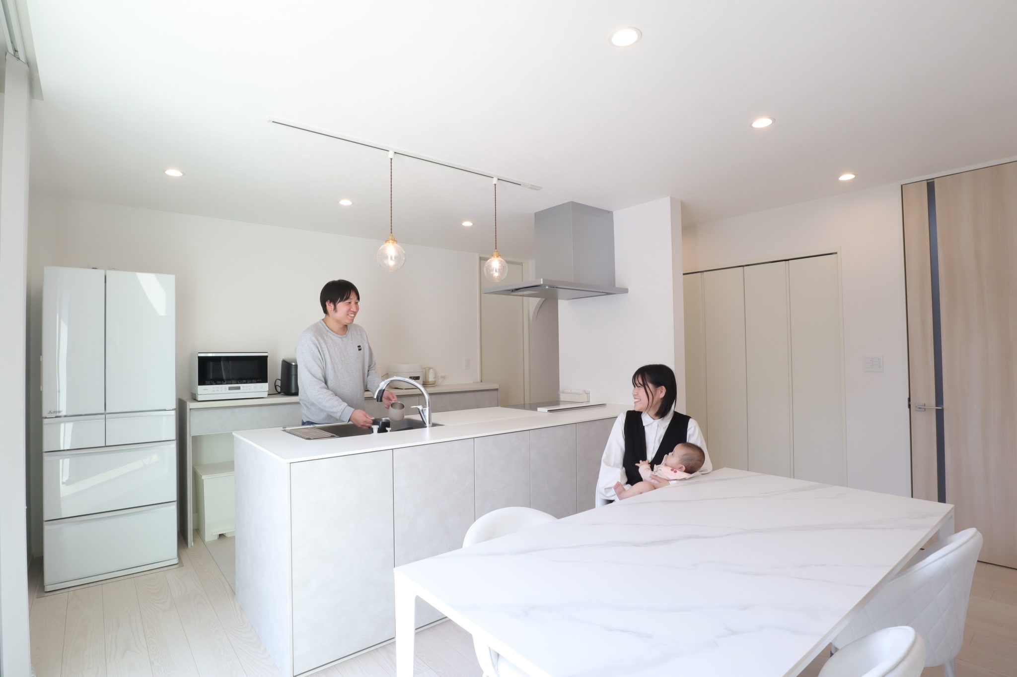 白とグレーで統一された明るい空間がひろがるN様邸。玄関とリビングの両方に設けた吹き抜けから心地よい光が差し込む、開放感たっぷりな住まいになっています。また、LDK⇔水廻り⇔玄関ホールが繋がる回遊性のある間取りを採用したことで、行き止まりのない生活動線が実現。家で居る時間が好きになる、快適な住まいが完成しました。