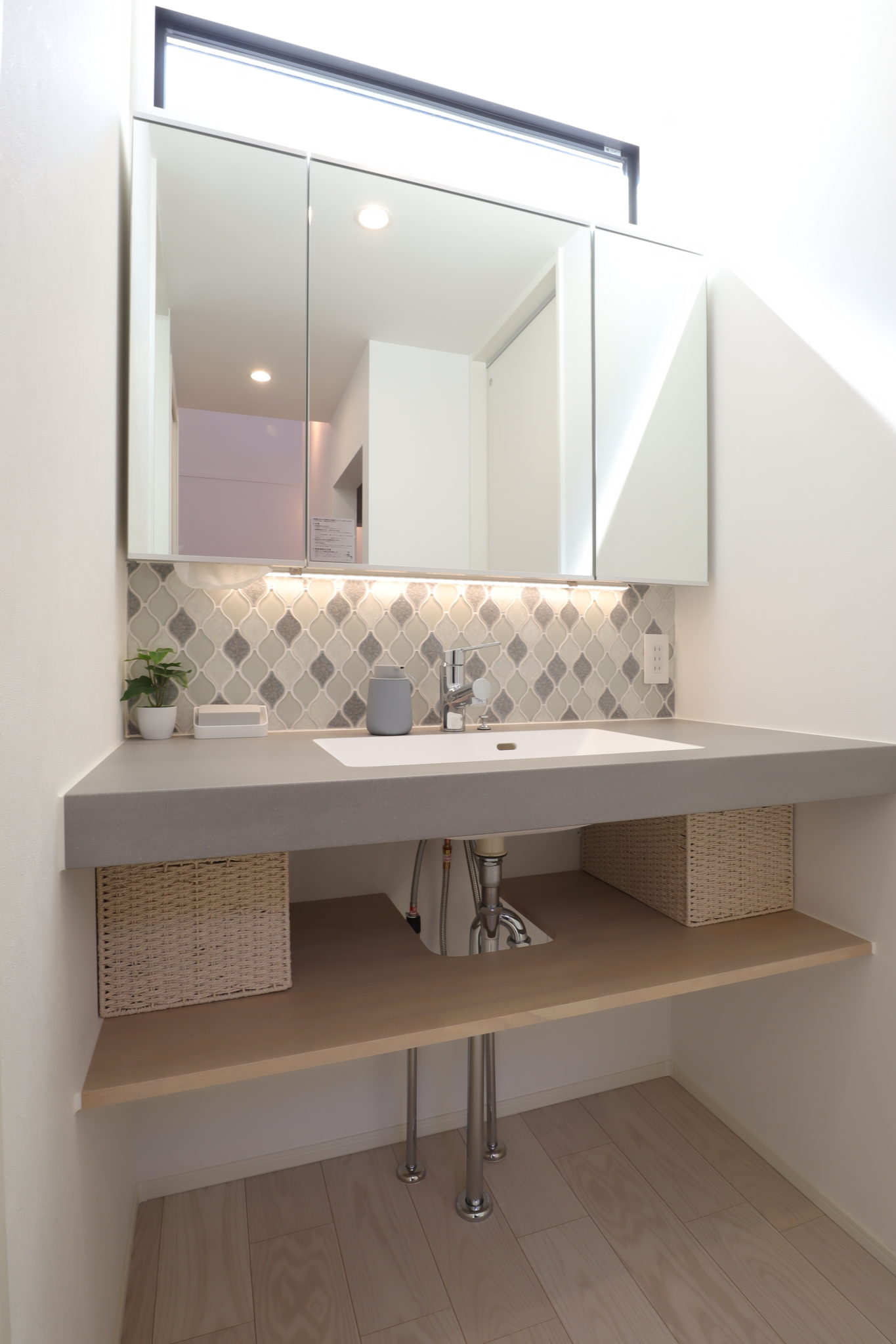 2人並んでもゆとりのある造作洗面台。白とグレーの優しい色合いでコーディネートされた空間は、慌ただしい日々に癒しを与えてくれそうです。