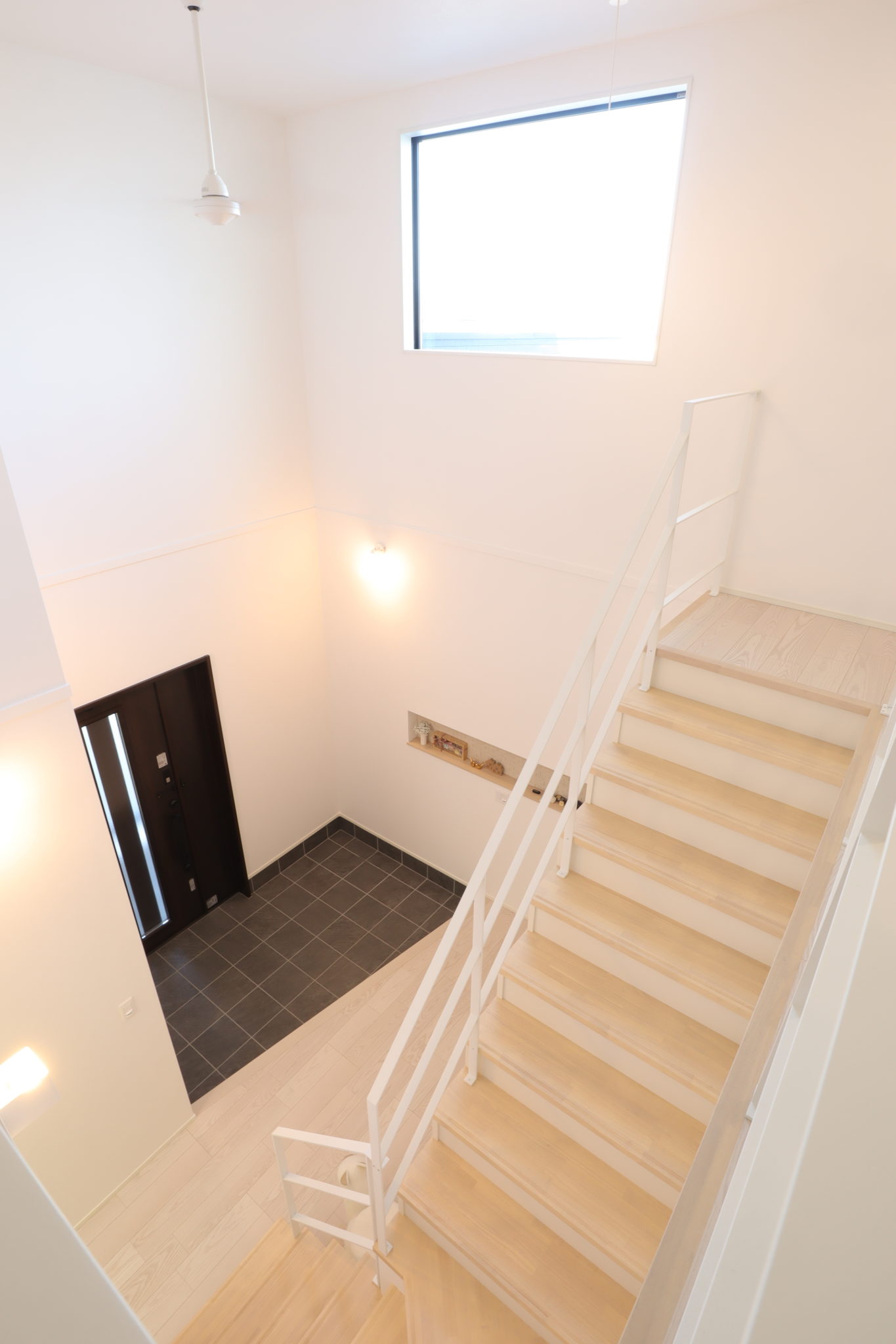 暗くなりがちな玄関ホールに窓を設け(吹き抜け部分)、明るい光が差し込む空間になりました。さらに、スチール手摺を採用したスタイリッシュな階段が、お家の顔になっています。