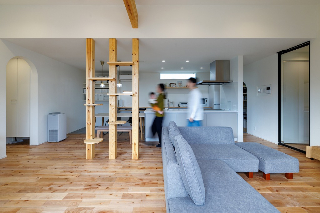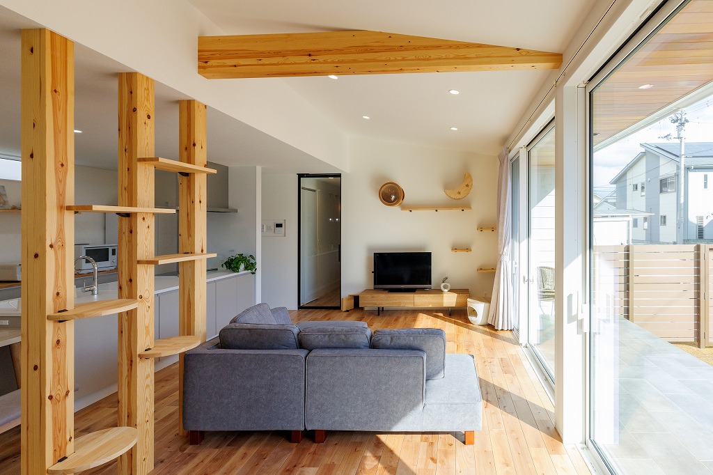 明るく開放的なLDKは、キャットウォークや猫用通路、ペットドア付きの建具など、猫2匹と家族で楽しく暮らせるアイデアがたっぷり詰まっています。