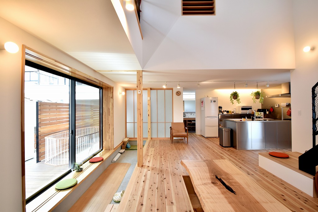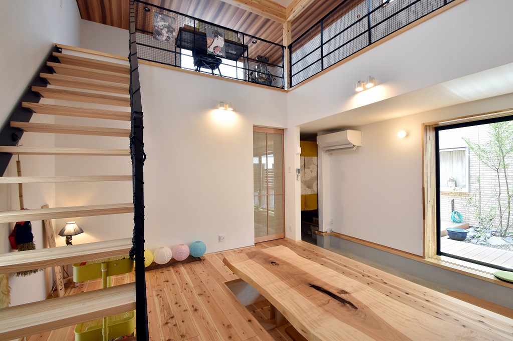 リビングの吹抜けや広い土間をもうけたことで、帖数以上の広がりを感じられるLDK(17.2帖)。床材やテーブル、建具など随所に木のあたたかみを感じる、居心地の良い空間に仕上がっています。