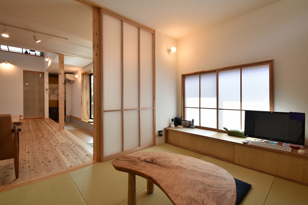 娘さんが“掘りごたつのある暮らし”に憧れを抱いていたこともあり、幅2mの掘りごたつと、それにピッタリ合う一枚板のダイニングテーブルをしつらえています。