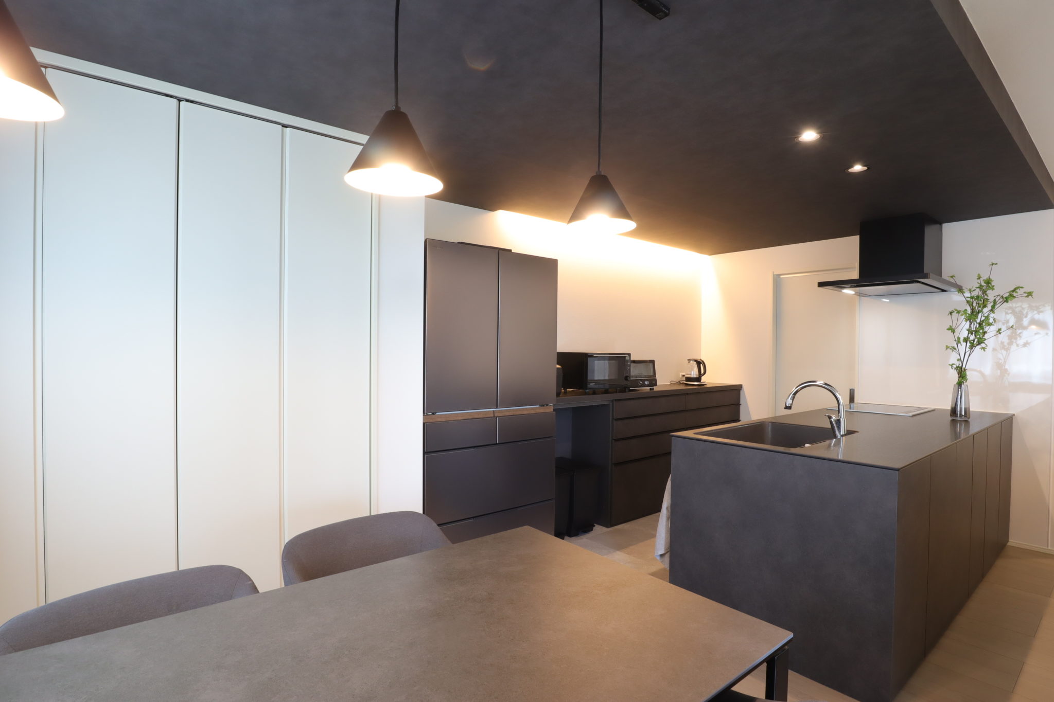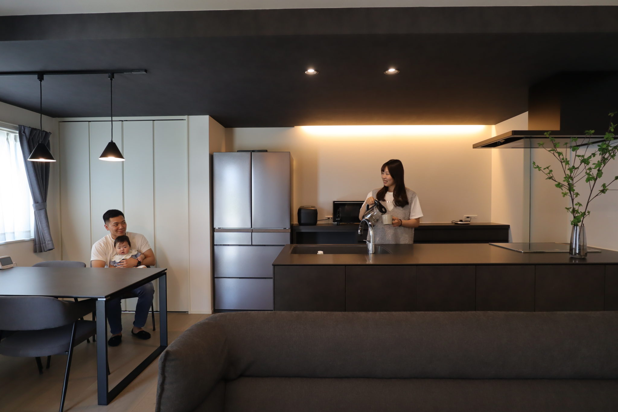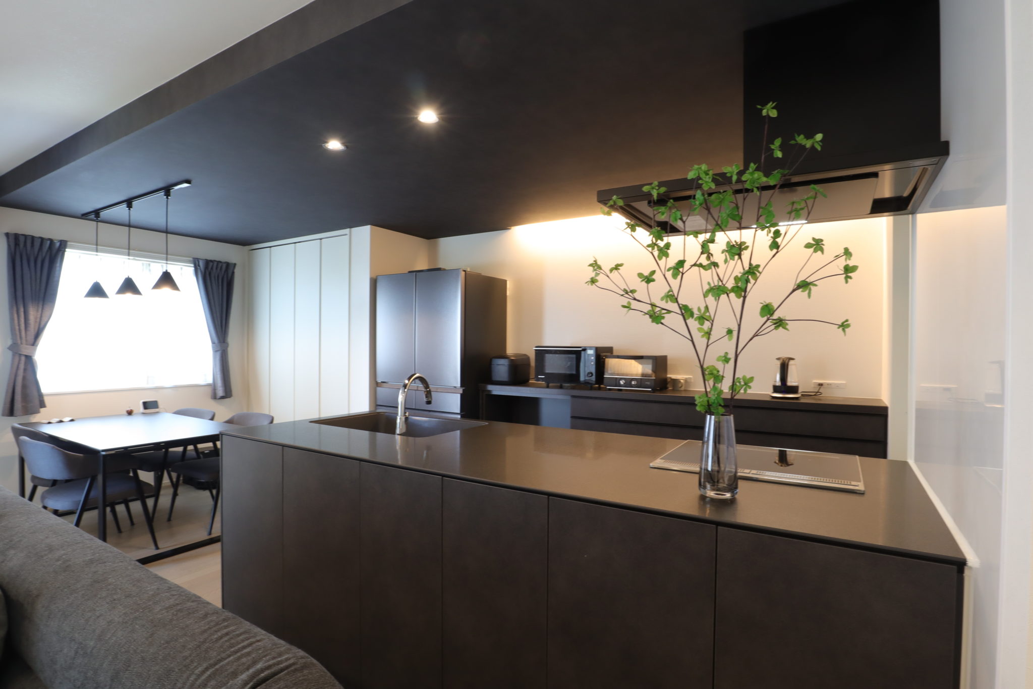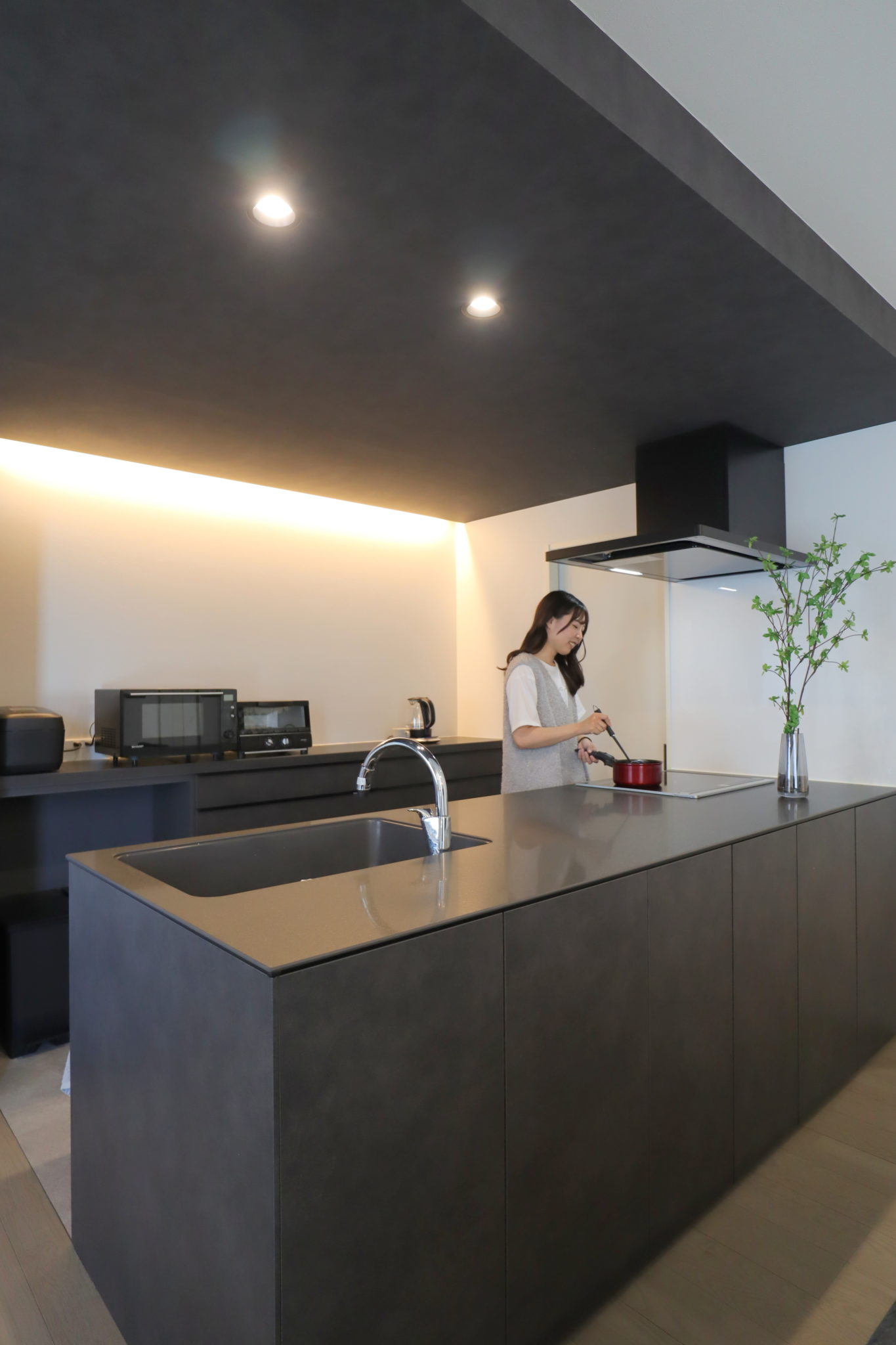 奥さまが一目惚れしたのは、重厚な柄や質感が魅力の『リシェルSI』。薄型の天板を選ぶことで、より洗練されたデザインに仕上がっています。さらに、ご夫婦ともに高身長のため、キッチンの高さは標準より高い900mmに設定。デザイン性と使いやすさを兼ね備えた、こだわりのキッチンスペースとなりました。