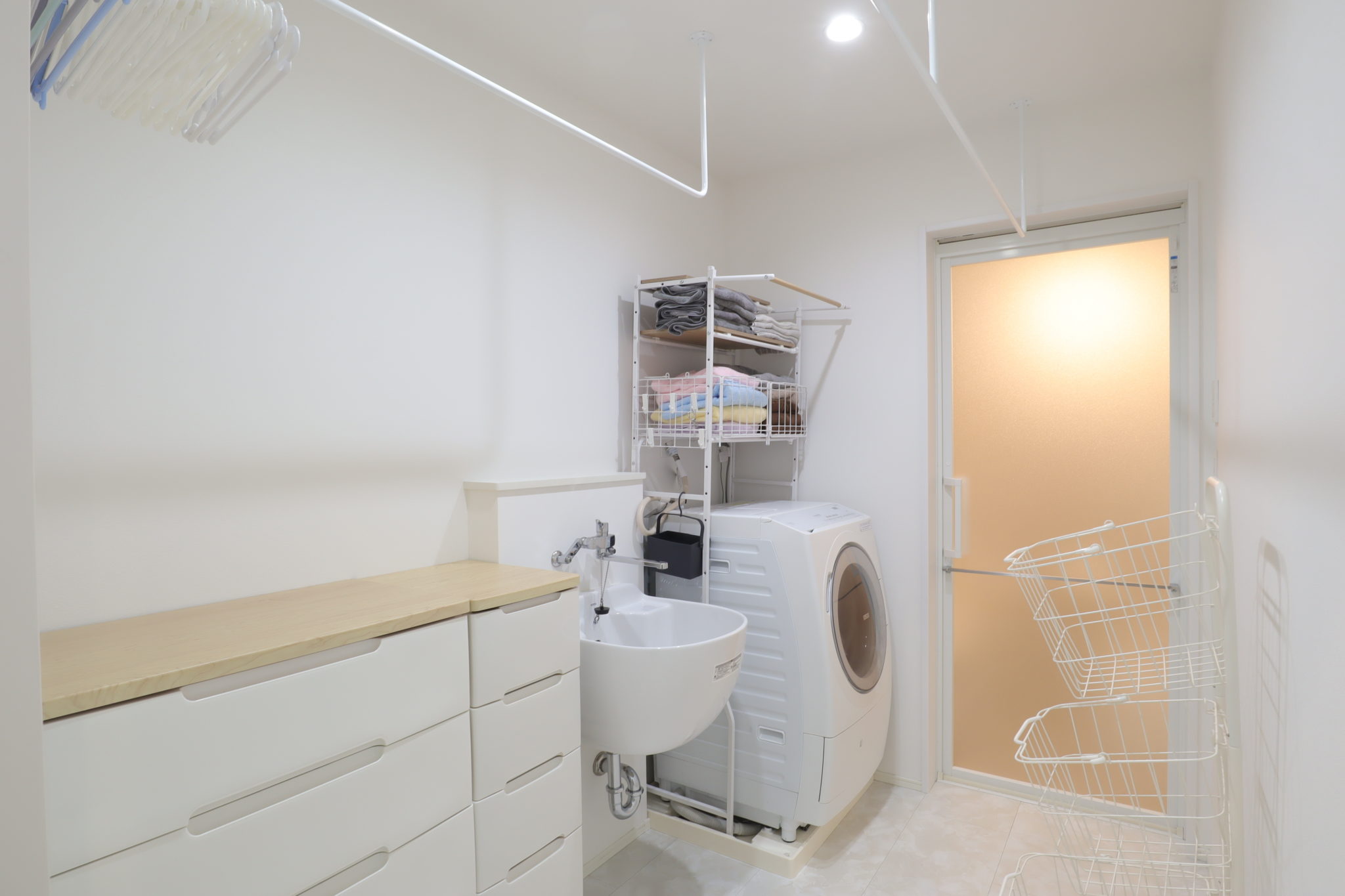 「洗う・干す・収納」がこのスペースで完結!隣にファミリークローゼットを配置しているため、洋服やアウターなども楽に収納することができます。さらに、手洗いする際に重宝するスロップシンクを採用。子ども服の食べこぼしや旦那さまのサッカーの練習着の予洗いとしても活用しているそう。