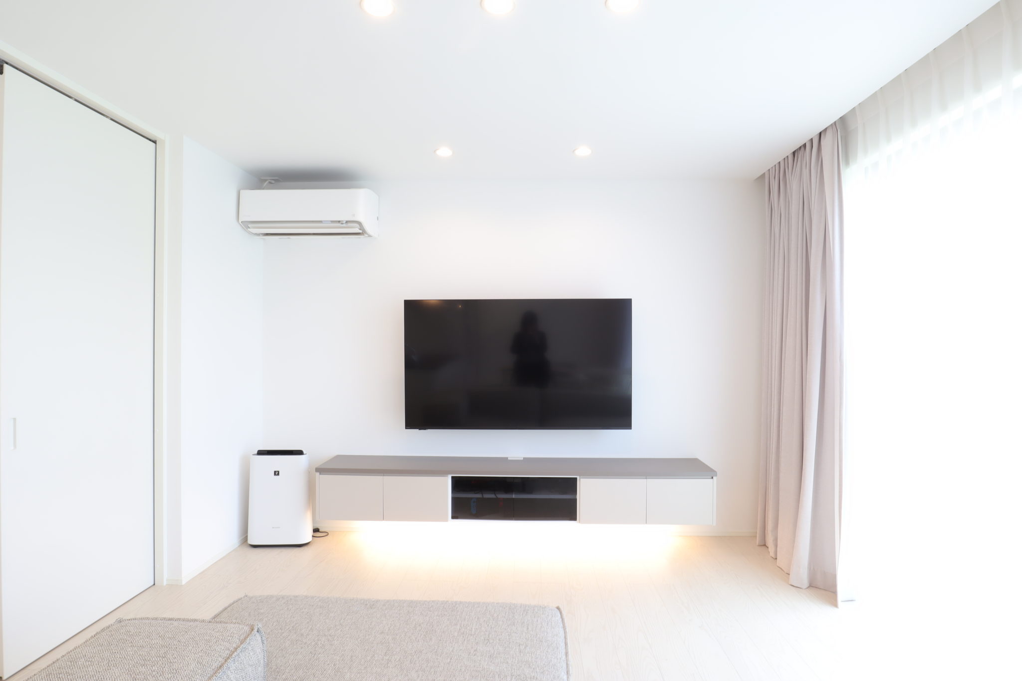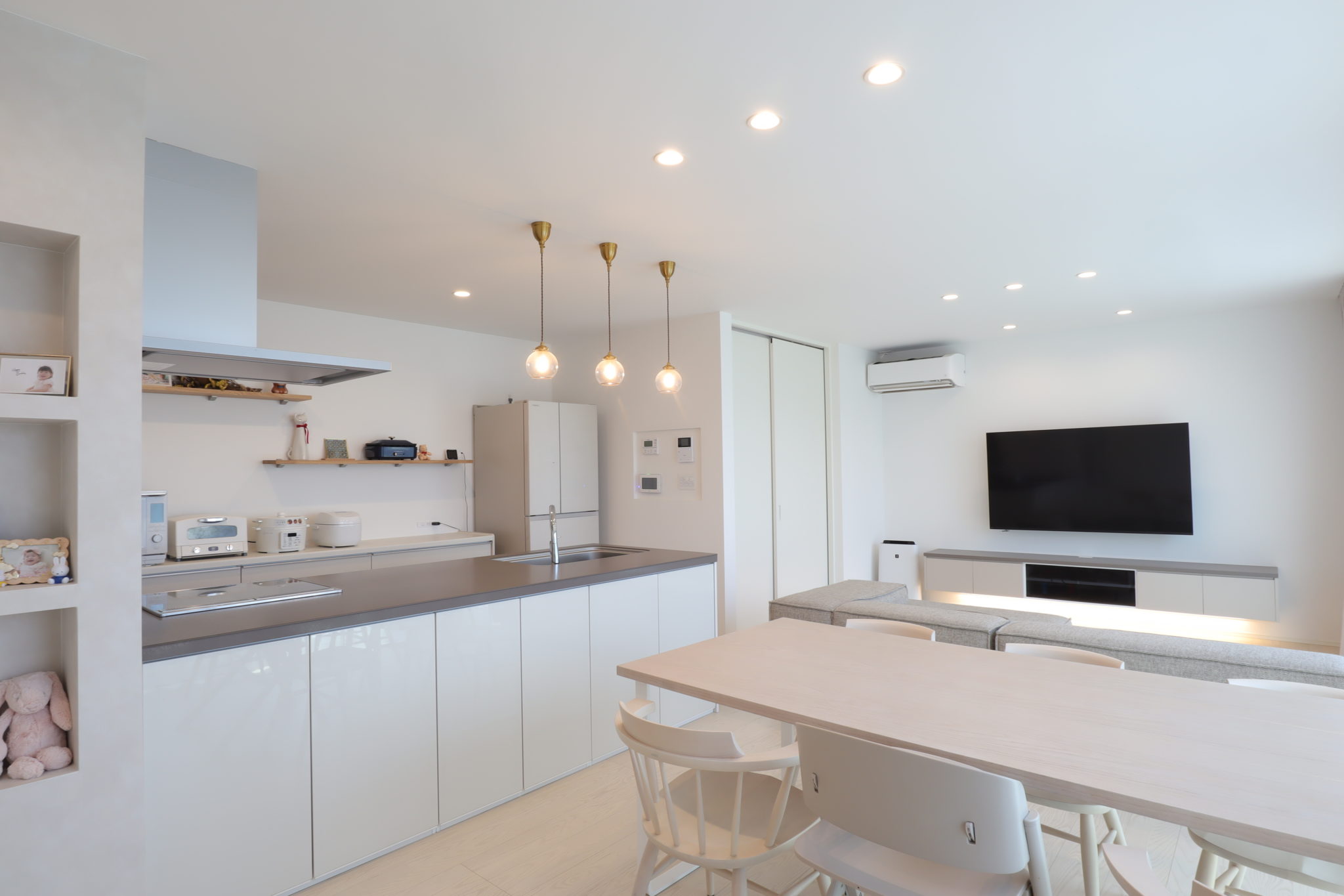 グレージュインテリアでまとめた柔らかな雰囲気のLDK。奥さまが一目ぼれしたという『リシェルSI』のキッチンカラーをベースに、内装のコーディネートをされたそう。テレビボードの配色もキッチンと合わせることで、空間に統一感を持たせています。
