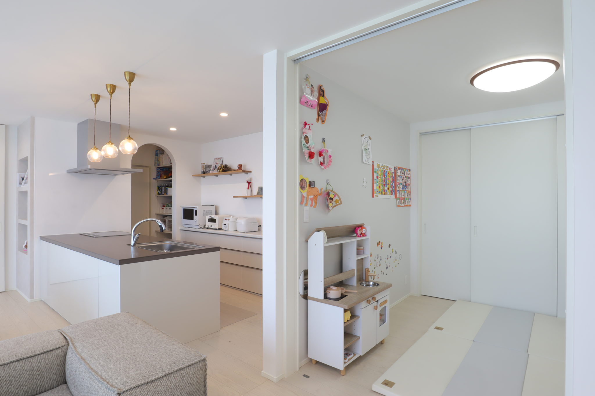 キッチン横の洋室は、幼い子供たちの遊び場。お子さまの作品や写真を飾れるように、壁の一面をマグネット対応のクロスにしています。家事をしながらお子さまの様子を確認でき、安心して過ごすことができるそう。また、将来的には夫婦の寝室として活用することも考え、建具を取り付けて個室として使用できるようになっています。