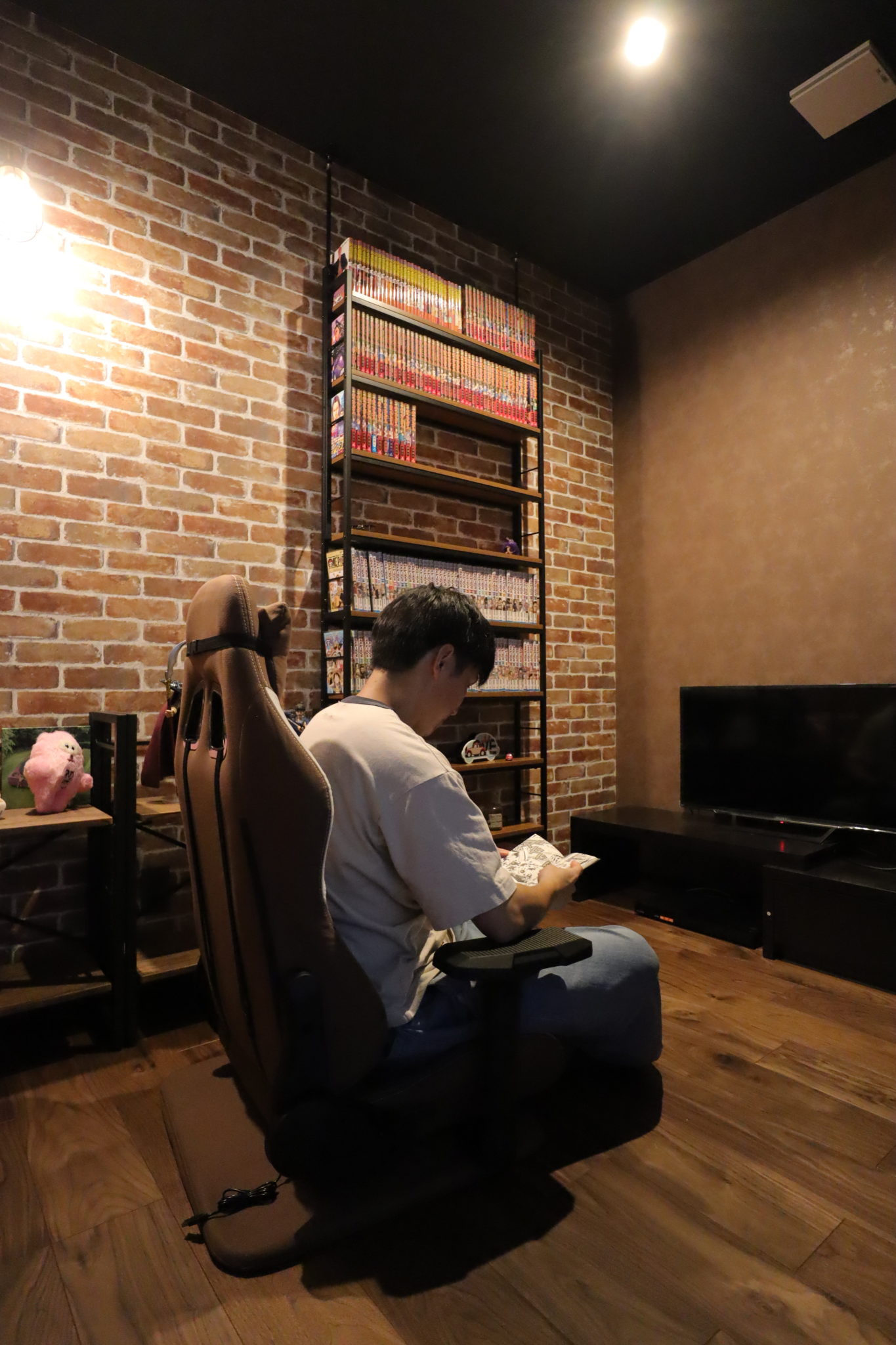 ブラウンとレンガ調のクロスを組み合わせた大人カッコイイ趣味部屋。ゲームや漫画を読むスペースとして活用しており、毎朝一時間早く起きて朝活をしているそう。お気に入りの空間で好きなことに没頭できるスペースです。