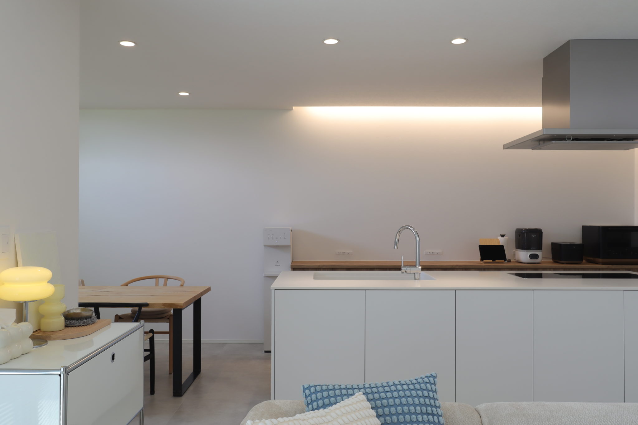 ″余白”と″光”を意識したLDK。お気に入りの家具が映えるようにシンプルなホワイトインテリアで計画。照明は、ダウンライトや間接照明を採用し光の落とし方にもこだわっています。時間帯や天候によって室内の表情が移り変わる、美しく心地よい空間です。