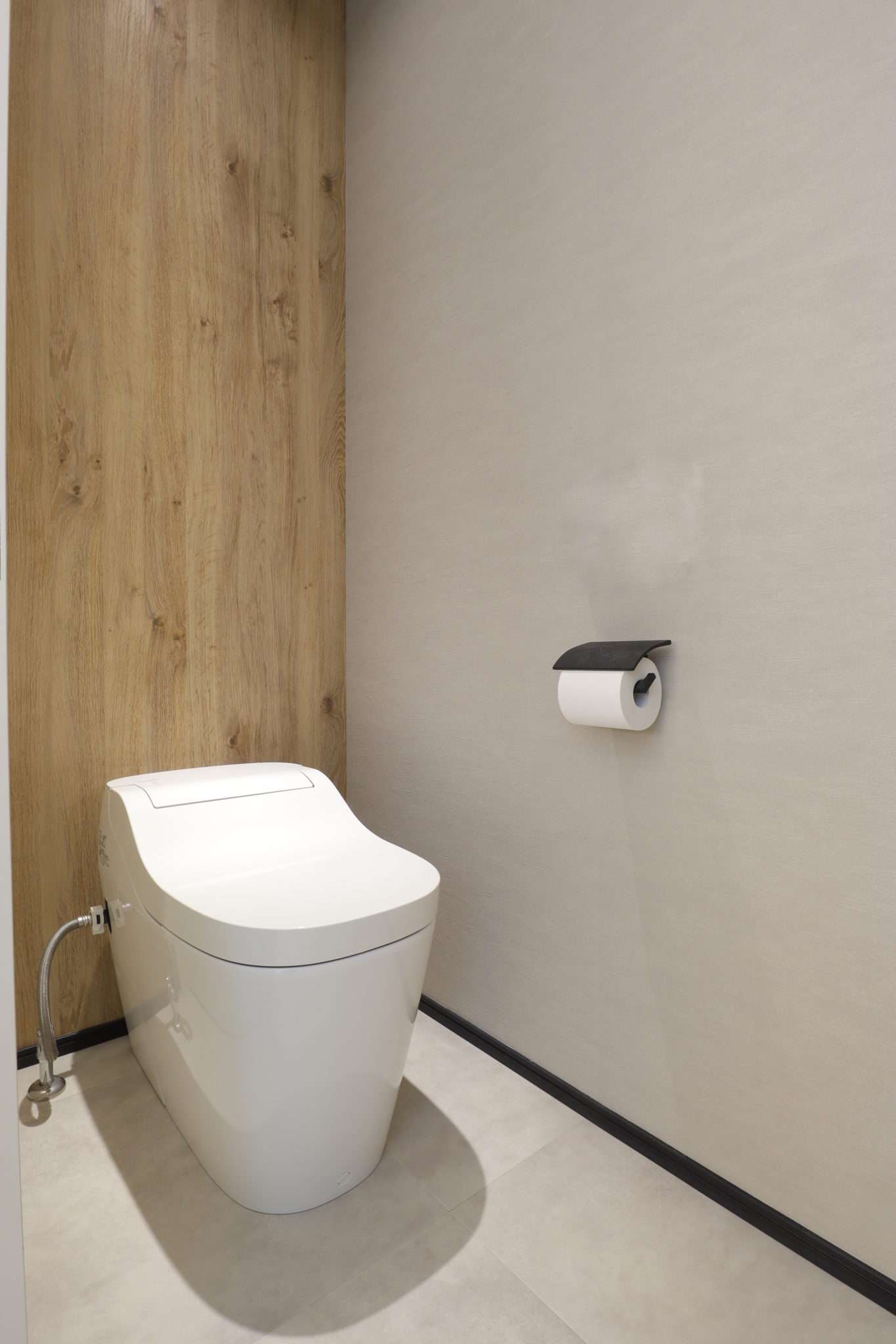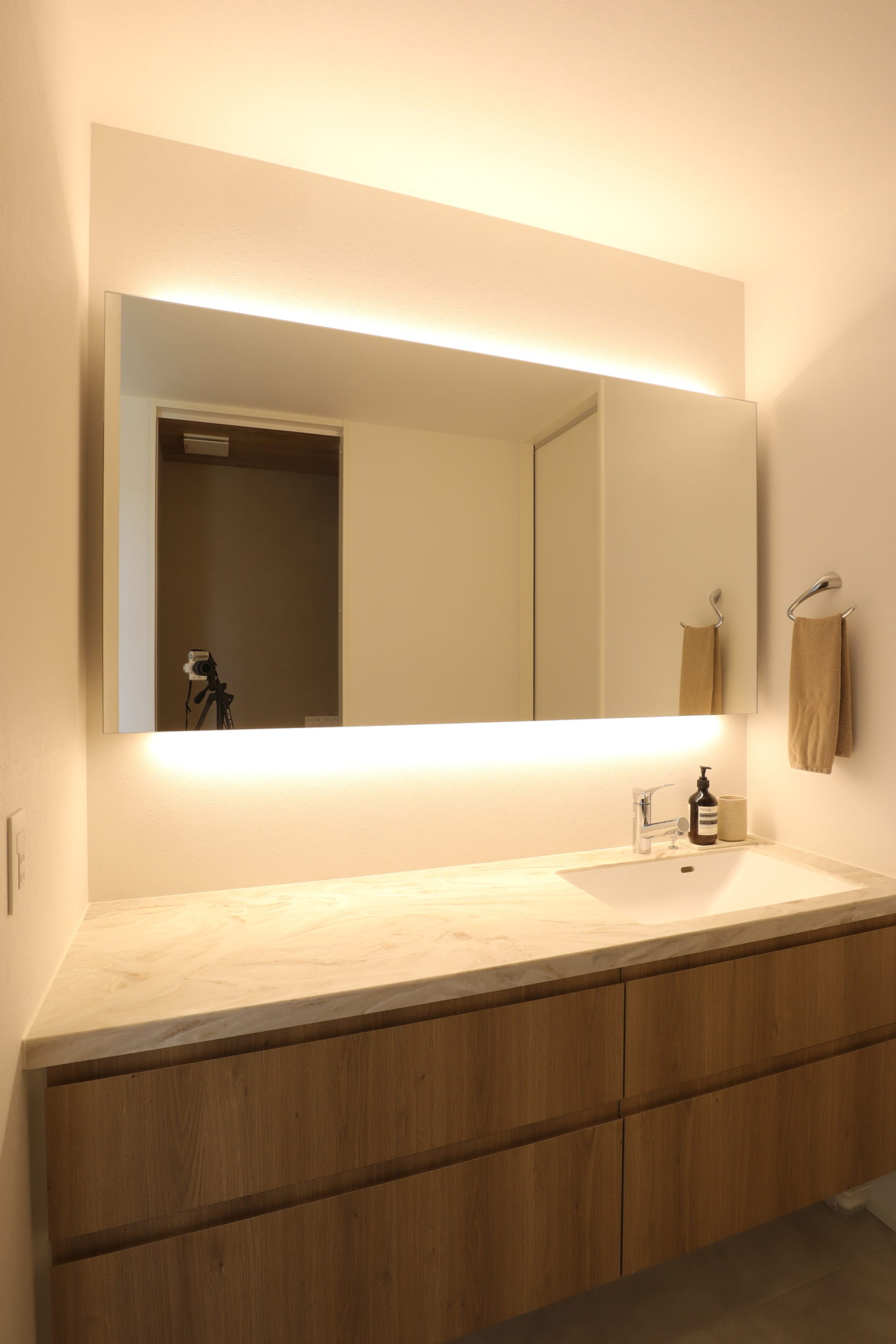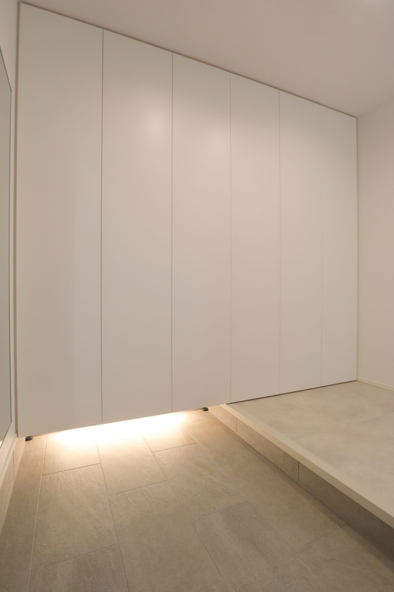 あえて流行りの通り抜けできるSCLを選択せず、玄関は広々と使えるように計画。ホテルライクな玄関をイメージし、SCLは造作で壁一面につくりました。