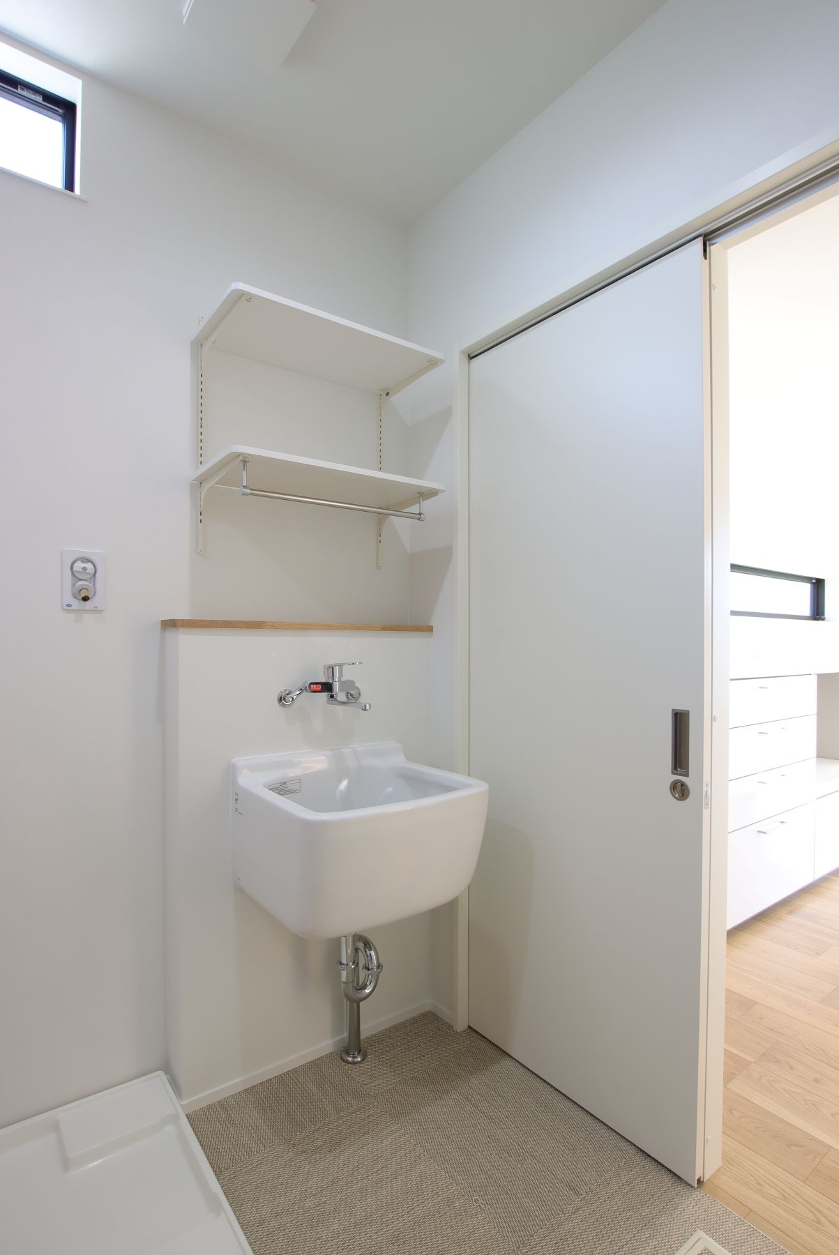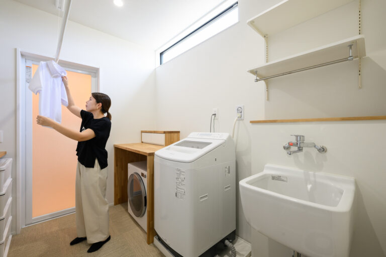 キッチンからランドリールームまでは直線動線。小物収納付きの造作棚は、ガス衣類乾燥機『乾太くん』と洗濯かごがスッポリ入る幅で仕上げました。スロップシンクも備え、ノンストレスな家事ができます。