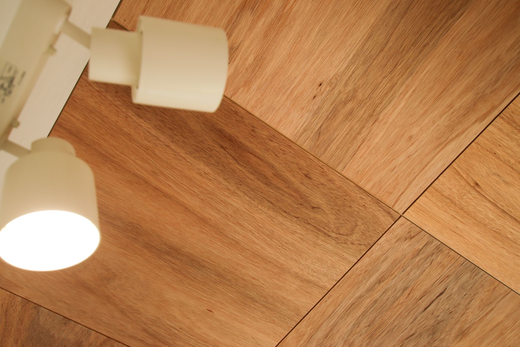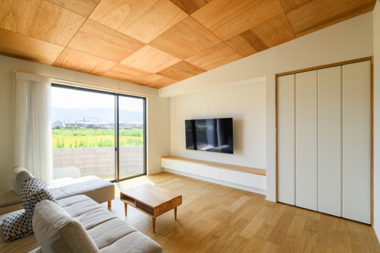 シンプルな中にも、天井をラワンベニヤで市松張りにしたことで、表情をプラス。造作のテレビボードと収納のドア枠はタモで統一するなど、細かな部分にもこだわりが光ります。
