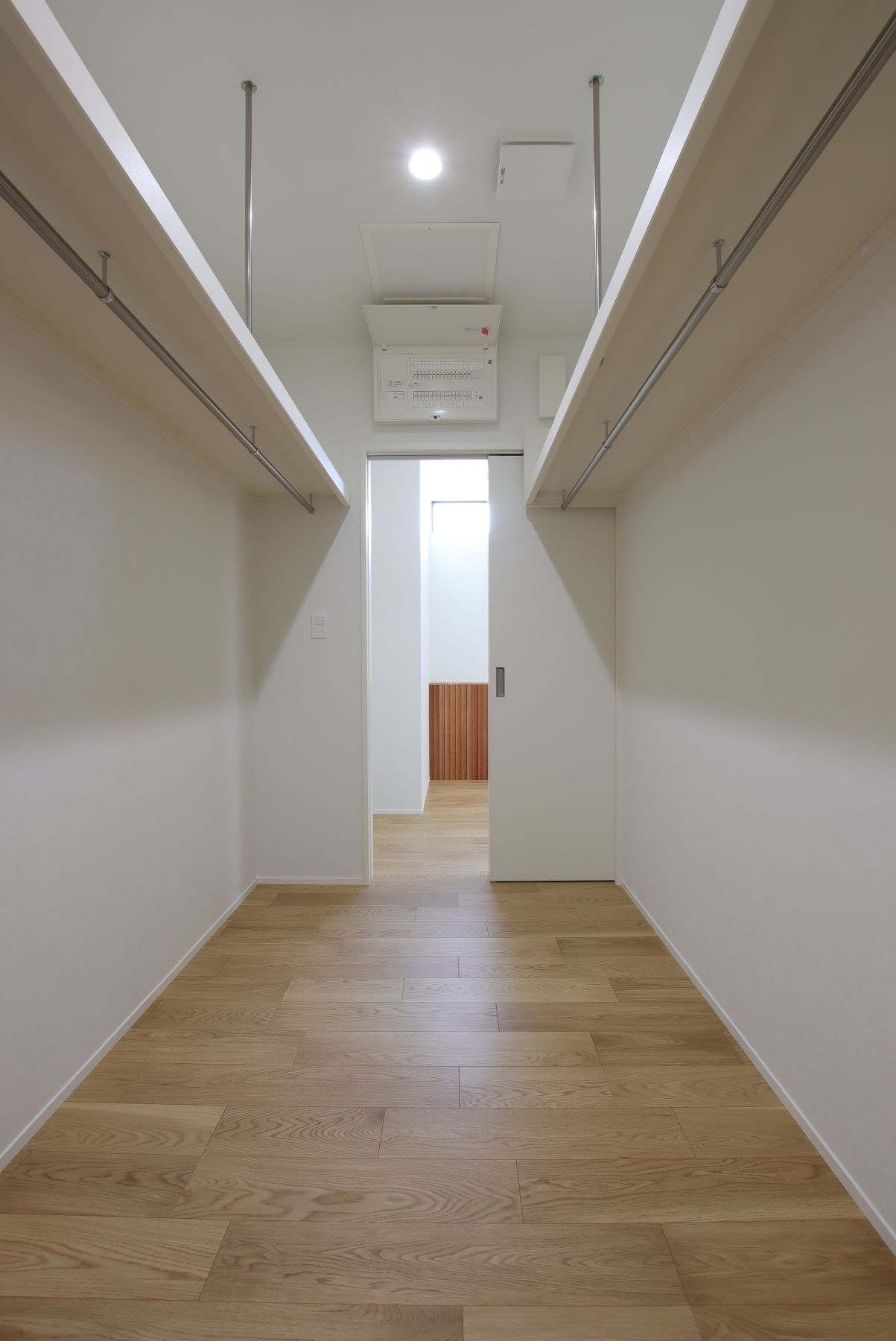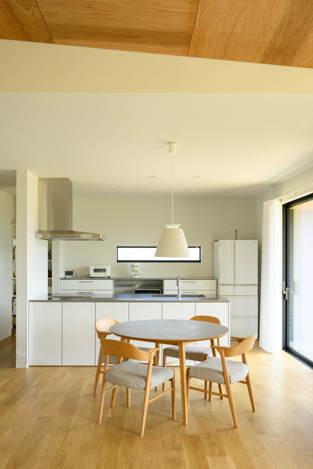白色を基調にナチュラル色の木質素材で整えられた、平屋。リビングの勾配天井はラワンベニヤで化粧し、印象的に仕上げました。